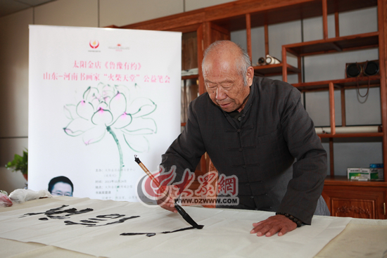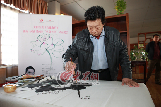 书画家现场创作 山东和河南自古以来就是文化大省,人才辈出。今天,太阳金店《鲁豫有约》山东-河南书画家“火柴天堂”公益笔会活动的举办,不仅促进两省的书画文化交流,同时与《视周刊》“火柴天堂”公益行动结合,更能向社会传递参与公益的正能量。 背景资料: 河南书画家: 书法家谢其厚先生。中国书法家协会理事,笔名闲云,生于1941年,河南商丘人;从事书法五十多年,11岁师从晚清秀才王子正为师。他独创的悬纸悬笔在书法界堪称一绝;曾多次在国家级比赛中获奖,作品被国家军事博物馆永久收藏。 画家蔡达,字金雨,号德达,法名释延良。生于1950年,河南商丘人。自幼酷爱丹青,拜在青藤、八大、李苦禅、宾虹名下,其作品《农家小院》在河南省首届艺术节入展并获奖;《升腾之龙》在韩国获四国联展一等奖;《牡丹笑春风》、《荷塘月色》分别获得中日联展金、银奖。 山东书画家: 画家徐文祥,别号童颜山人,师从著名画家李承志,作品收录于《当代国画家辞典》、《山东美术家辞典》,生于1962年,山东济南人,现为山东画院画师,山东省美术家协会会员,中国书法家协会会员,济南市美协理事,中国国画家协会理事等职位。 刘持昀 字久光,1975年出生于山东菏泽,1996毕业于菏泽艺术职业中专,后进修于天津美院,得霍春阳,贾宝珉,贾广健等先生指教,在临摹传统的基础上逐渐富有个人气息,作品富有生活,形象生动活泼,色泽丰富明丽,格调清新秀润,现为山东省美术家协会会员,山东文人书画院理事,济南市鹊华书画院副院长,中国美术出版社书画名家会员。