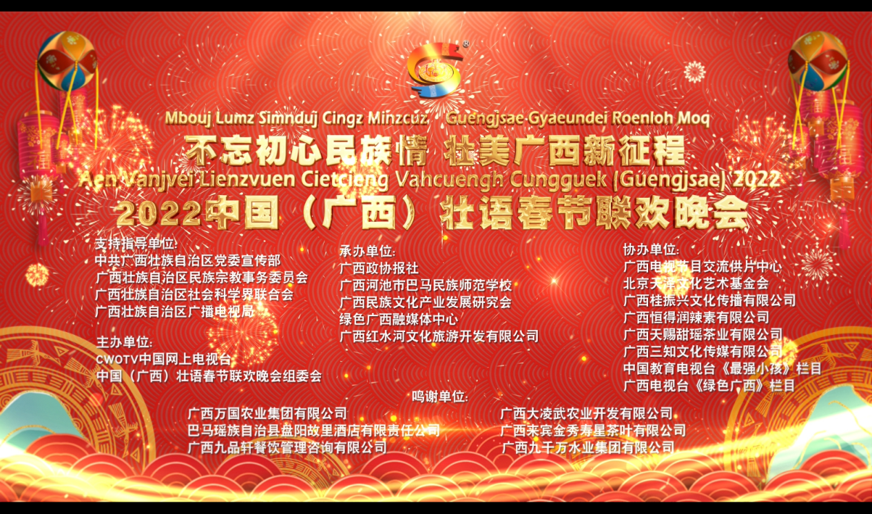 福虎迎新年,年味日渐浓!2022中国(广西)壮语春节联欢晚会正式官宣,将于春节期间在各大平台播出,目前已进入倒计时阶段。本届春晚从源远流长的壮乡历史文化中寻找新的创作灵感,从独特魅力的民族文化中提取新的创作元素,让观众在欢乐幸福的氛围中感受壮乡文化的时代风采,抒发壮乡儿女的民族自豪感。 晚会以展现壮乡美,表达壮乡情,传承壮乡文化为主旨,设置开篇扬帆新起航和永远跟党走、壮乡最幸福、祖国更美好三个主题篇章,高度融合民族歌舞、民族乐器、民族美食等元素,内容丰富精彩,值得期待、不容错过! 本届壮语春晚节目使用大小屏深度融合,结合专栏、短视频、直播、图解、H5等形式和5G、VR、大数据等新媒体手段,通过电视、网站、移动客户端跨屏传播,国内国际全媒体、立体化、即时性呈现2022中国(广西)壮语春节联欢晚会相关情况。截至1月28日,绿色广西融媒体中心在新华网、央视频、新华在线网、微信、视频号、今日头条、华人头条、优酷等多个平台共发布稿件200余篇(条)。 开篇 扬帆新起航 ![]() 歌舞《壮乡人民感恩党》 第一篇章 永远跟党走 ![]() 2. 歌曲《承诺》 3.歌舞《红水河太阳河》 4.歌舞《好比甜糕层叠层》 5.歌曲《党旗高高飘扬》 6.壮族民歌演唱《唱响核心价值观》 7.歌伴舞《星星伴月亮》 8.歌曲《保密人》 第二篇章 壮乡最幸福 ![]() 9. 歌曲《幸福花开》 10. 绝技表演《壮族古狼兵绝技》 11.歌舞《壮族老家》 12.歌舞《绿色广西》 13.乐队演唱《嘿!贝侬》 14.民族舞蹈《舞动壮乡》 15.歌舞《歌的家乡》 16.诗朗诵《壮美花山》 17.民族铜鼓舞《铜鼓欢歌尼呀啰》 18.歌曲《又见三月三》 19.歌曲《贝侬来喝酒》 第三篇章 祖国更美好 ![]() 21.山歌联唱《桂韵民歌颂党恩》 22.壮语小品《心愿》 23.歌舞《启航的摇篮》 24.乐队演唱《山歌唱广西》 25.歌舞《情歌赛过春江水》 26. 双排键演奏《最炫民族风》 27.集体歌舞《贝侬多如星》、《领航》 (具体节目以当晚直播为准) 这是一场壮乡儿女倾情演绎的春晚,挖掘壮乡悠久历史文化,拓展神韵八桂的无穷魅力,推动壮族文化的传承与发展,繁荣乡村文化,助推乡村振兴。展现国家战略下的壮乡新气象、智慧科技引领的新高度、广西文旅之美的新视角,让观众感受广西全区经济社会飞跃发展以及独特的历史人文魅力。 我们用壮歌传唱壮乡情,用民族舞蹈展现壮乡美;感受党的百年光辉历程,展现壮乡人民感恩党、听党话、跟党走,坚定信念建设新时代中国特色社会主义壮美广西! |