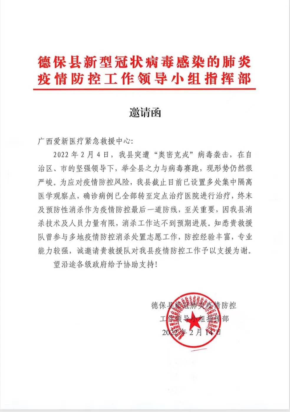 为应对疫情防控风险,截止目前,德保县已设置多处集中隔离医学观察点,确诊病例已全部转至定点治疗医院进行治疗,终末及预防性消杀作为疫情防控最后一道防线,至关重要。因德保县消杀技术及人员力量有限,消杀工作达不到预期进展,2月14日,德保县新冠肺炎疫情防控工作领导小组指挥部向广西爱新医疗紧急救援服务中心发出了支援邀请。疫情就是命令。2月15日,广西爱新医疗紧急救援服务中心组织专业救援力量,派出抗疫先锋队赶赴德保县进行疫情防控消杀处置工作。