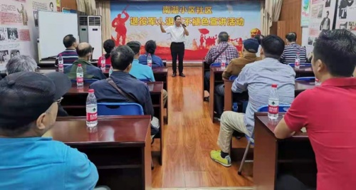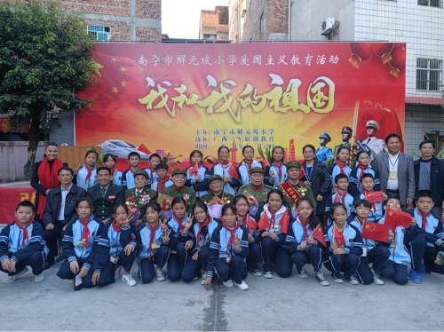 曾胜恩在南宁市解元坡小学参加爱国主义教育活动宣讲后与师生合影 黎 坚 摄影