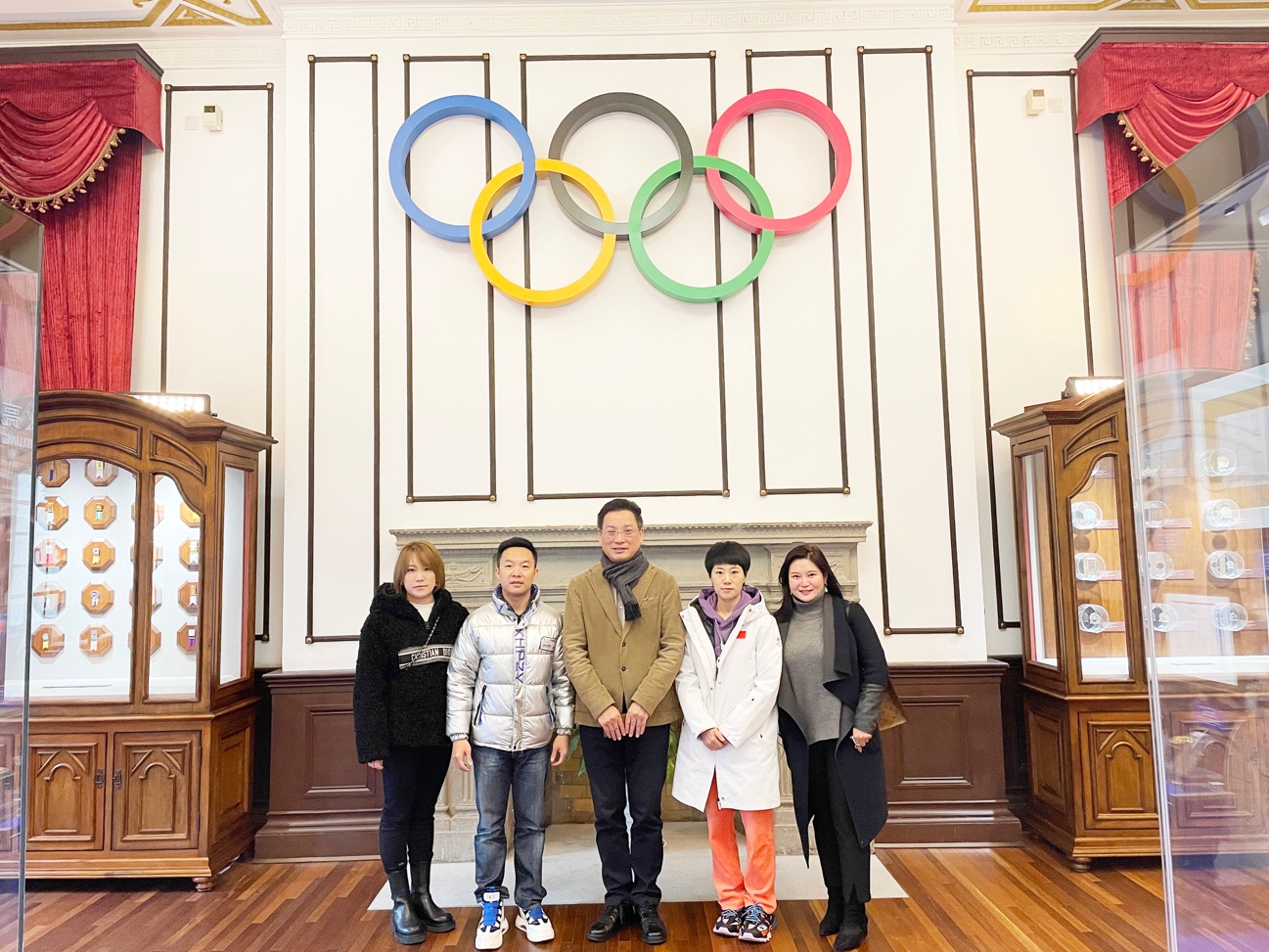 奥林匹克博览会组委会秘书长、北京奥林匹克文化促进会执行主席夏斯均(中)和奥运冠军郭伟阳(左2)、2022冬奥会护旗手 、奥运冠军张会(右2)、上海海康贝公益基金会代表万珏(左1)参观上海体育博物馆 2020年2月22日,奥林匹克博览会组委会秘书长、北京奥林匹克文化促进会执行主席夏斯均携两位奥运冠军郭伟阳、张会来到上海。