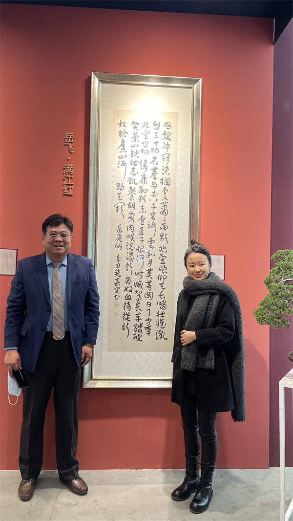 嘉宝女士最喜欢的是创作的这幅岳飞的《满江红》,所以,挂在展览的第一幅。这幅作品一气呵成,有驾长车踏破贺兰山处之气概,也有雄襟万里的回肠。客观地说,文静靓丽的嘉宝女士,不像战争年代作家丁玲女士,乃是昨日的文小姐, 今日武将军,纤笔一枝谁与似? 三千毛瑟精兵,却写出了怒发冲冠,万丈豪气,足见嘉宝女史之境界,完全可以神接古人,气接天宇。