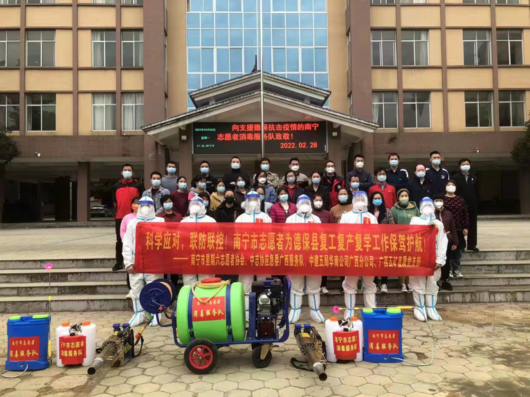 3月2日,由南宁市星期六爱心公益志愿者协会、中志协应急委广西服务队、广西国田集团服务队、中建五局华南公司广西分公司、广西五矿直属党支部、青建百东置业服务队、北京众安公益、广西壹方慈善基金会、广西蓝博旺科技等机构组成的南宁市志愿者消毒服务队,在圆满完成疫情防控消毒杀毒工作后凯旋归来。