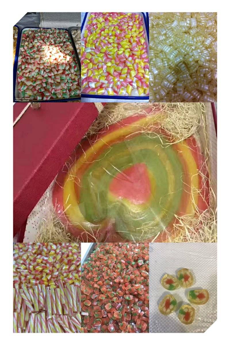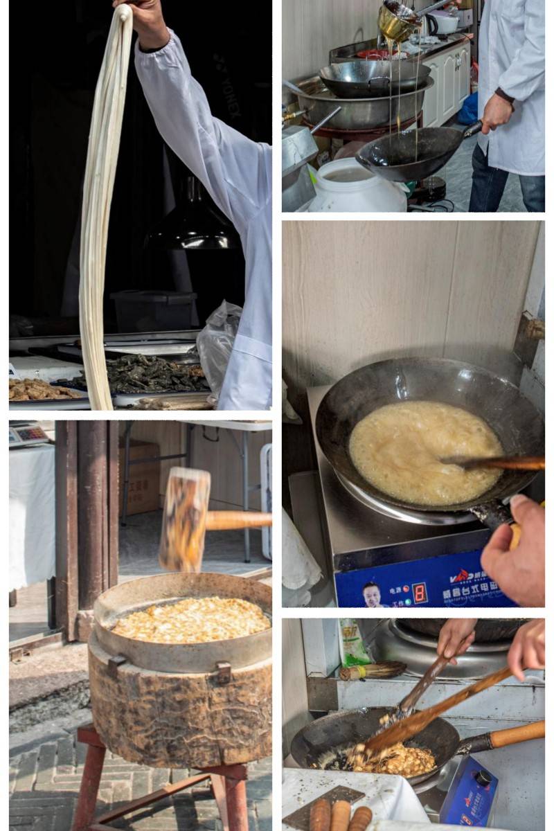 首先,他舀了勺麦芽糖稀,告诉我们这是专门定制的,成分都很有讲究,比较独特。其糖有的有保健作用。比如,这个软糖是用红薯粉做的。那个姜糖可以预防感冒。梨膏糖和你小时候四十年前在上海豫园吃的梨膏糖一模一样,可以治疗咳嗽,滋润肺部等。而含有核桃芝麻的糖非常香松脆,老年人小孩都很喜欢吃。随着时代发展市场的变化和需求,人们的口味不断提高,舌尖也变得挑剔。这里有的松脆品种都是后来在他父亲的基础上发展和创新改善的。而年轻人孩子过生日来定制,就要加入现代糖果卡通卡娃伊的元素,很神奇,也没有模具,戴老板依旧能用巧手做出来如玻璃般五彩的系列,一圈又一圈的心形状糖果,漂亮又带唯美浪漫,我们似乎被带入了童话世界,深受年轻人的喜爱。 糖在锅里面继续翻滚着,戴师傅加了点食用油,搅拌着,又加入了苏打粉,他告诉我们是为了发酵,我查了度娘,原来苏打有健胃美容除垢的功效。 过一会锅里冒了气,他试了下已经结晶,连忙加入核桃花生等材料,折叠在一起,再放在一个木墩的铁皮平锅里,用七八斤重的木槌敲打几百下。最后拿到案板上,切出形状。这样的糖制品,味道就不用说了。 第二种是牛皮糖,糖在锅里滚一会后,放入一口加了菜油的锅里,锅不断的转着,慢慢结晶好,透亮透亮的,在案板上滚上芝麻,用赶杖赶平,卷起来,切好即成。 第三种糖球。这种烧制做法的步骤与上相同,结晶好的糖稀,用两个签子一搅一拉,反复多次成白色,有点像拉面,拉透后,放入案板,拉开放入豆粉,包好成柱状,像做馒头一下,拉出一团一团,压成饼,糖球做好了。 戴师傅真像变魔术似的,麦芽糖到了他手里非常服帖,一气呵成,一件件香甜可口的手工糖产品用了大约一个半个小时就做出来了。