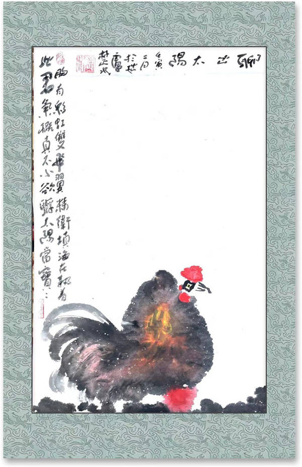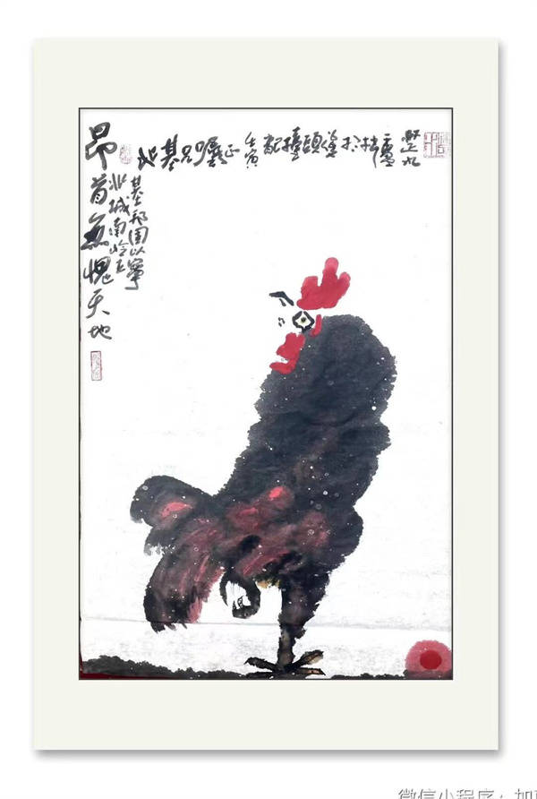 --画完后,总觉得题款不够,有点像孟姜女,变成望夫石,又能怎么样呢?于是乎,又画了幅,仍然美其名曰:孵出太阳,但题款却略改两句: 此君气概不算小 欲孵太阳当宝宝 胸有彩虹自飞翼 精卫填满在执着