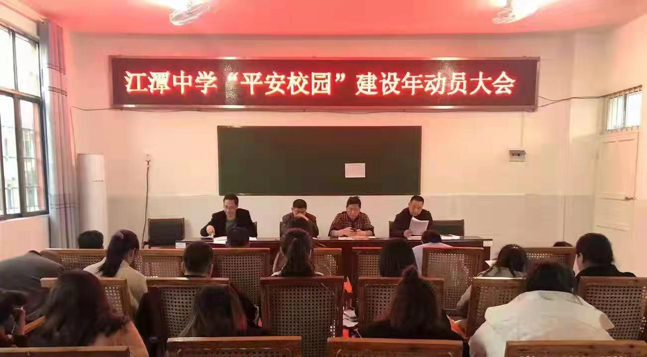 为深入开展“平安校园”创建工作,全力营造平安和谐的教育教学环境,切实保障全体师生人身和财产安全,3月8日,洞口县石江镇江潭中学开展平安校园建设年动员大会。晚上6点,全体教师准时到达教学楼二楼会议室与会,此次会议由校长谢光辉和副校长王永顺主持。