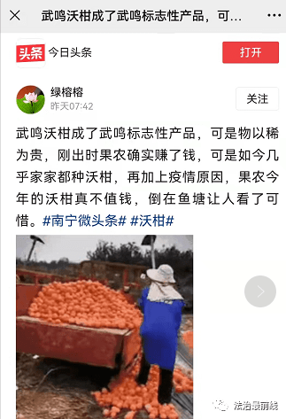 近日,今日头条推出推文报道,说武鸣沃柑行情批发价低等没有外地老板来收购,果农将自家的沃柑一车接着一车往鱼塘里倒。