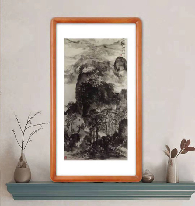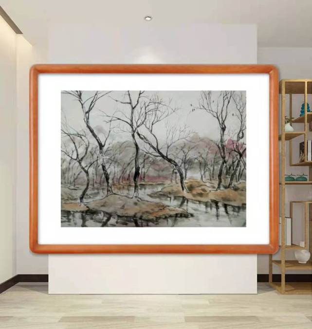 周境尧作品 山水画是周境尧先生心灵情感的迸发,是感知自然的心得。他的山水画作品,格局远大,气象淡远雅逸,一派简淡冲和、虚静空灵之美。体现出笔墨的古朴、典雅蕴藉的审美意趣;更多的是传统文化所追求的恬静、闲适的品格。在整体的诗意美与清新的韵致中,体现了传统美学、时代精神相融的特殊魅力。他的创作注重对山水的质感与体积感的表现、注重对于自然光感的捕捉与表达,对透视效果的借鉴;特别是对云层、树木、山石、水中透出的散点透及立体感和远近空间感等效果的表现;其明暗、虚实以及丰富的光影变化,既是对自然光线下不同云烟色彩与气象的生动写照,又是对自己胸中主观意象的艺术表现。