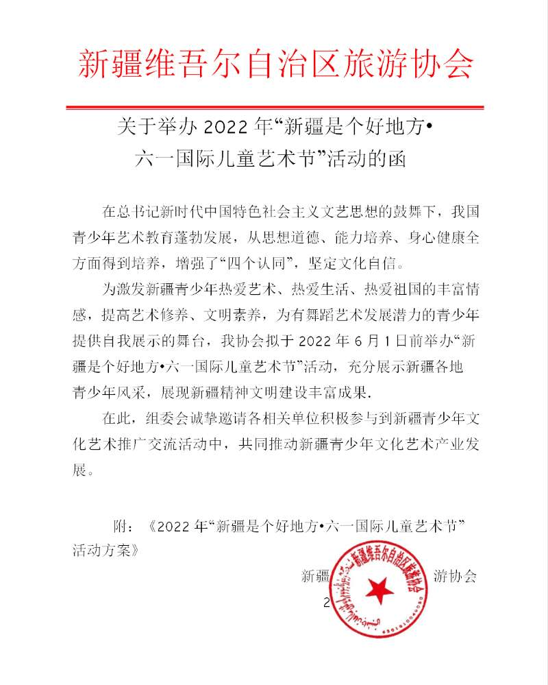 为了青少年文化艺术的培养能够在思想道德、能力培养、身心健康全方面得到提升,增强了“四个认同”,坚定文化自信,通过精心组织开展形式多样、生动活泼文艺活动,激发新疆青少年热爱艺术、热爱生活、热爱祖国的丰富情感,提高艺术修养、文明素养,为有舞蹈艺术发展潜力的青少年提供自我展示的舞台,我协会拟于2022年6月1日前举办“新疆是个好地方”六一国际儿童艺术节活动,充分展示新疆各地青少年风采,展现新疆精神文明建设丰富成果。 |
