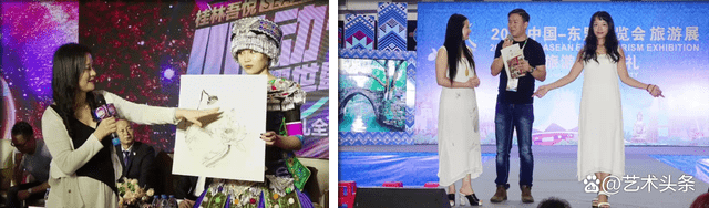 (右)中国东盟博览会旅游展台上绘制旗袍与讲解。