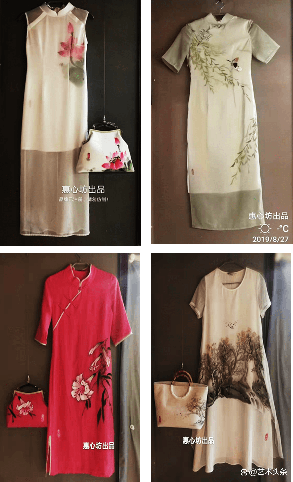 由于秦子惠有着扎实的中国工笔和写意基础,二者的结合运用使诸如山水、牡丹、玉兰、荷花等人们喜爱的审美对象,在女性的旗袍和手提包上与女性妩媚的身姿融合,展现出女性特有的神韵和迷人的风采。这一新颖的审美样式和精湛的艺术展现,获得了爱美女士们的广泛喜爱和追捧,在广西工艺画坛上独树一帜。为此,秦子惠建立了自己的品牌“惠心坊”,并成立了“桂林市惠心坊艺术品有限公司”,亲自担任公司法人和总经理,形成集工艺品、字画、服装、服饰、鞋帽、箱包制作、销售于一体的经营体。