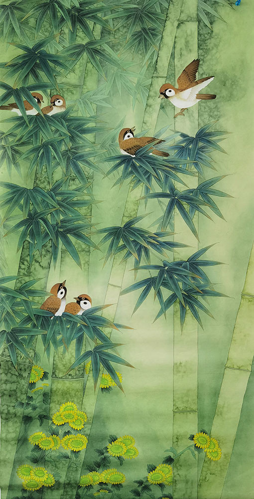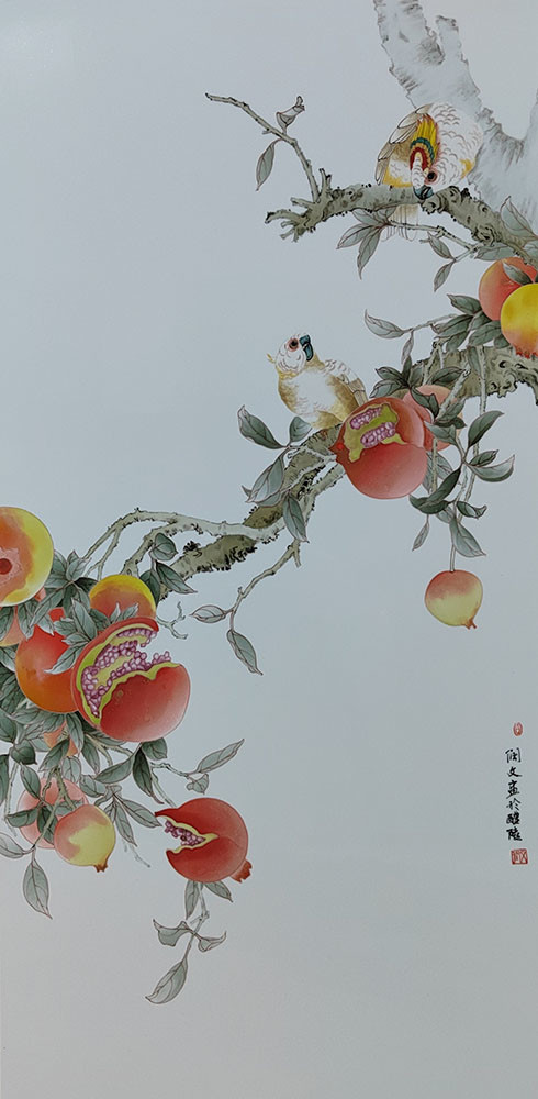陶润文作品 陶润文先生是当代中国画坛德艺双馨的艺术家,始终坚持传统的进取路线和艺事作风,对中西绘画艺术有深刻的领悟。他的工笔花鸟,形象刻画生动自然,格局简约精巧,气象淡远雅逸,体现出一派简淡冲和、虚静空灵之美。在继承传统工笔画语言中,陶润文先生将西方绘画的线、点、光、用色渗透到自己的画中,形成了既有现代审美价值又有个人独特的艺术语境。可以看出,陶润文先生极为遵循“精于形象而意味横生”的艺术要点,将绘画艺术与时代文化融为一体,画意与诗境相互交融,使自然景色的表现气韵生动、意境浓郁、层次丰富,呈现出诗情画意的艺术境界,这无一不给人以悠远沉静的古雅之美。通过有寓意,有内涵的绘作物像,以精到的笔墨、淡雅的色彩,以及巧妙的构思,将己身清雅的心境寄予色彩、线条之中,用情至真、表情达意,所造之境合于自然,动静结合的韵律中,实现了整体的清新幽雅,从而达到形神并至,笔境兼夺的艺术效果。