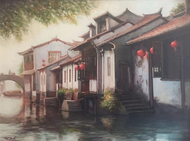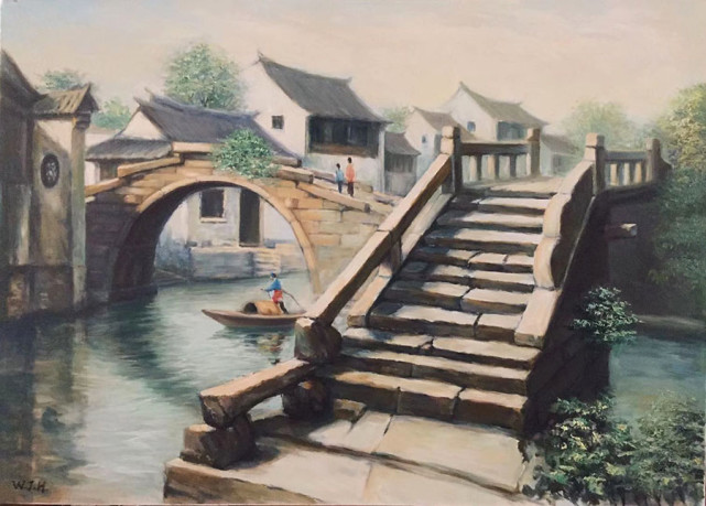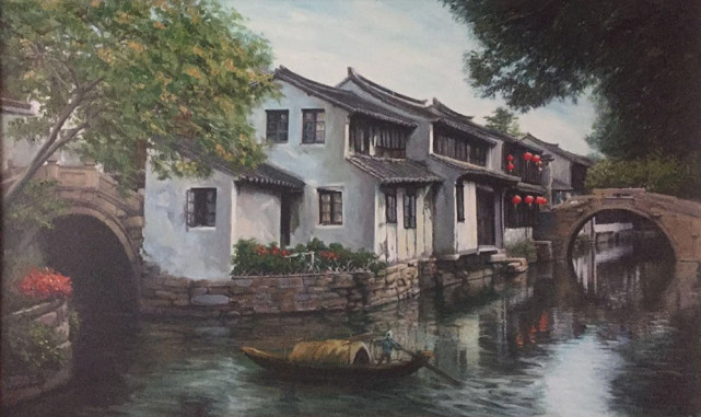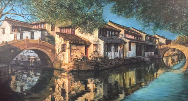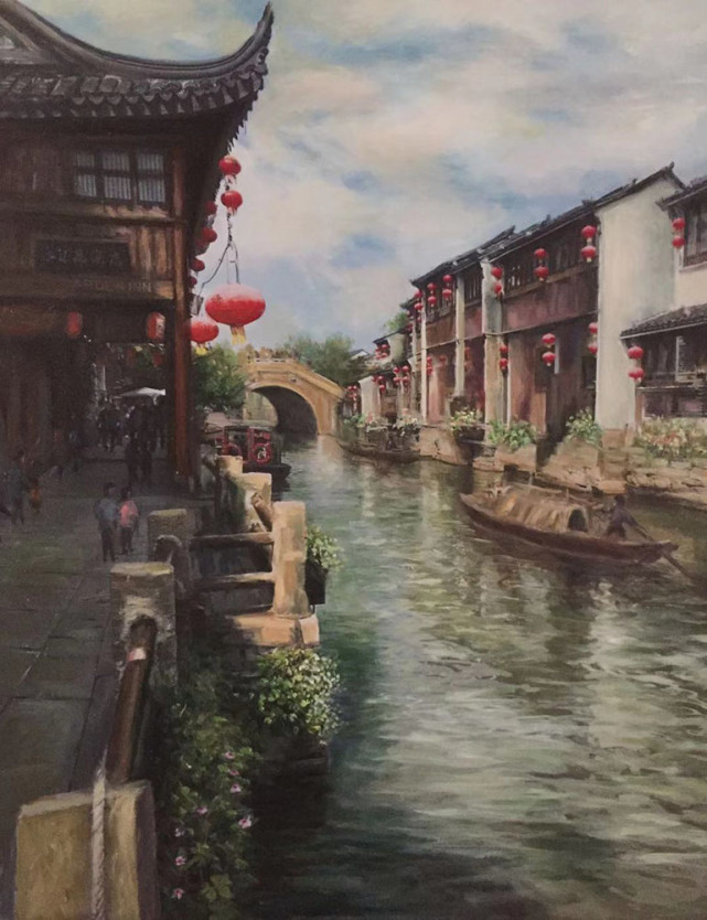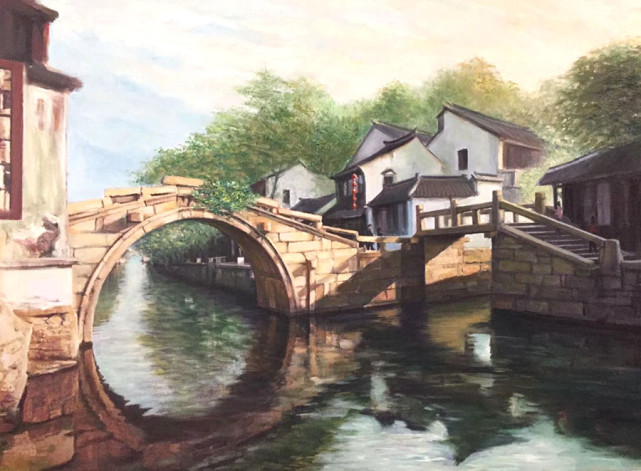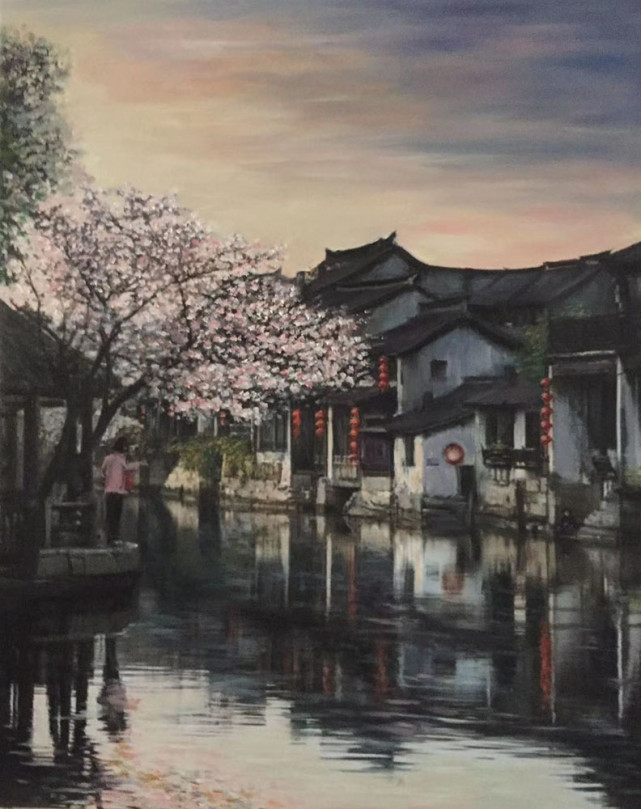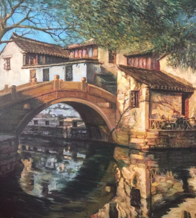 ![]() 油画特别强调色彩的表现力,讲究构图,布局和画面的立意及意境,从而使作品富有内涵和生命活力。色彩是油画中最富有表现力和感染力的艺术语言,是艺术家表达内心世界和思想情感的呈现。作为德艺双馨的艺术家,王金华特别注重情感立意的表达。他从古典写实出发,将结构性的造型与写意性的笔触融为一体。尤其将形象的典型性与油彩的表现性相互融合,把色彩、光影化作心灵的赞歌,表现了蕴涵在历史和生活中的江南水乡。