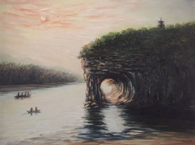 王金华作品 在风景油画创作的过程当中,王金华展现出了自己不俗的绘画技巧,给观者带来了颇具审美意趣的艺术作品。在他的笔下,江南水乡的雅致与宁静展露无遗,从意象到立意,画面笔触鲜明协调,追求画面调子的和谐统一和色彩的微妙变化,处处洋溢着蓬勃的生机,散发着一种诗意的美。王金华将形成于心中的文化观念、艺术精神转化为视觉审美画面,用生动的色彩,适度的肌理印迹,将民居、石桥、翠林、树木、湖水等诗意化境连成整篇;从而完全释放油画特有的感染力,将其蕴含的深意表现出来。在画面的烘托以及整体把握上,王金华把自然中的形态、色彩、线条、空间与气候、阳光、空气等诸多因素在他的画里积淀、交汇、凝练,形成了主观精神和客观物象的浑融为一,从而对主题思想实现有效的传递。无论是风光秀丽的江南风景,还是物象的写实立意,风格的新颖,审美内涵的丰富,标志着王金华找到符合自己的油画语言,使观者能够感受到他在彰显作品内在精神方面的追求。