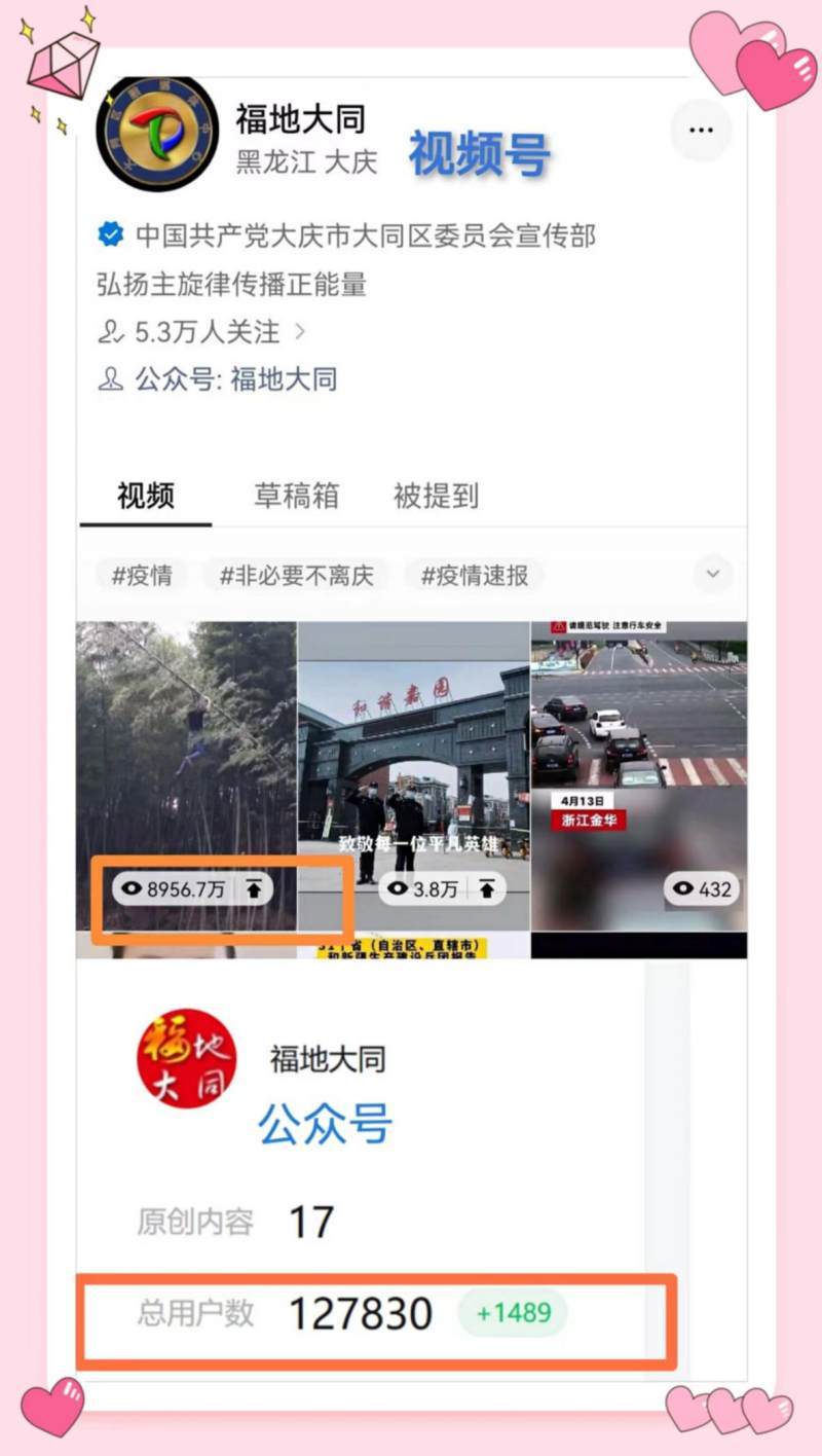 作品热度不断攀升。2021年至今,大同区融媒体中心发布的新媒体作品累计浏览量已超过3亿次。其中微信视频号单条最高浏览量达9000万次,创单条短视频点击率新高;今日头条号总浏览量达6600万次;新华网新华号总浏览量为4300万次;人民日报号总浏览量为1300万次,其他各平台的浏览量也获得大幅提升。