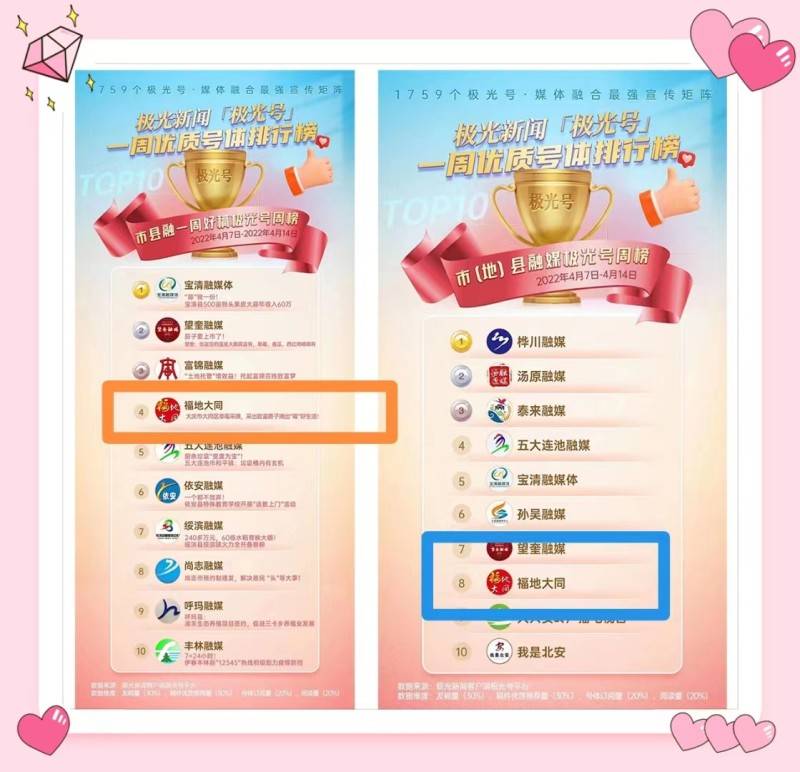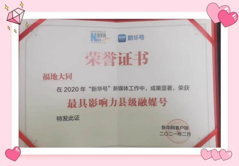 多家平台获取殊荣。“福地大同”账号现已入驻今日头条、人民日报人民号、新华网新华号、微信公众号、龙头新闻等15家媒体平台。其中《福地大同》新华号以4300万的总浏览量获得2020年度全国最具影响力县级融媒榜前40名的好成绩,区融媒中心也成为我省唯一一家荣登该榜单的媒体。“福地大同”账号在极光新闻、掌尚大庆两个平台的总浏览量均位列全市官方账号排名第一。《福地大同》极光号是全市唯一一个区县级优质号排行榜两项入全省前十名;2021年学习强国平台选发福地大同报道60余篇。