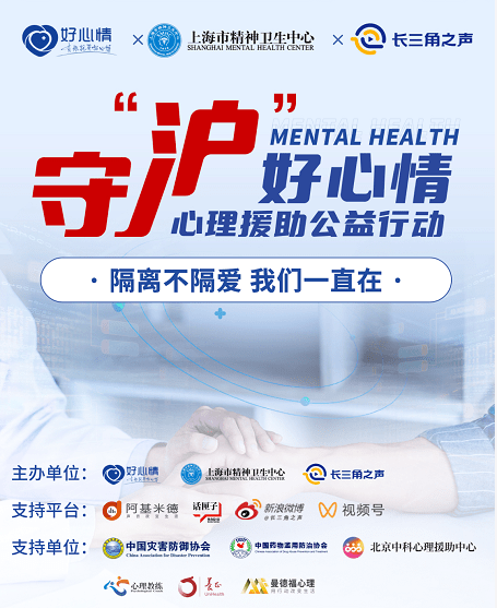为了更好地守护上海民众的心理健康,好心情心理服务平台联合上海市精神卫生中心、上海人民广播电台长三角之声共同推出:守“沪”好心情——心理援助公益行动。此次行动获得了长三角之声管及其新媒体平台如官方微博、微信、视频号以及阿基米德、话匣子等平台和中国灾害防御协会、中国药物滥用防治协会、北京中科心理援助中心、心理教练、养正心理、曼德福心理等多家单位的大力支持。