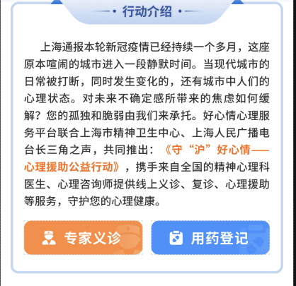 (部分义诊专家) 此次公益行动,上海市精神卫生中心特别组织了数十人的精神科医生队伍,携手来自好心情心理服务平台全国的精神心理科医生共同提供在线义诊服务,为广大上海市民的心理健康保驾护航。 在疫情新局势下,部分患者面临“购药难”的问题,为此好心情特别开发了《用药登记》服务,用药登记由好心情抗疫助手完成信息收集,严格保密用户的信息,同时会根据填写的需求联系政府相关部门寻求帮助,寻求到帮助后会与用户留下的信息联系后续配送事宜。