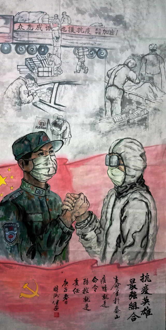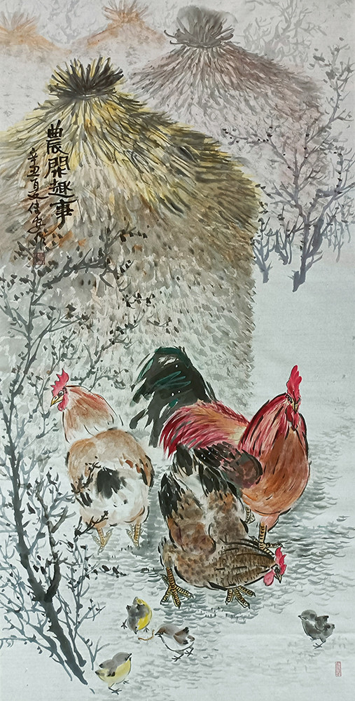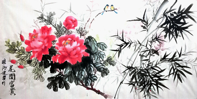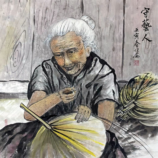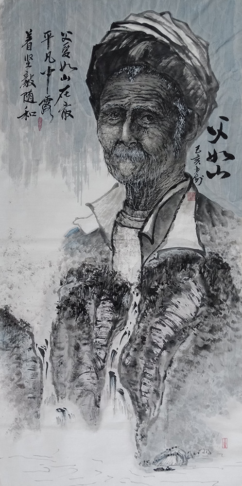 母亲50X65(2015年创作) 冯健安先生在长期的创作中,始终坚持传统笔墨的意境表现,着意于传达灵动之美,展现出清新、焕然、大气的写意气象。他的笔下的人物,都有自己独特的相貌特征和性格禀赋,荡漾着浓郁的生活气息,保持简约、厚重、灵动、大方的整体感和高品位。对人物神情、形态、精神的点化极为精微细致、干净明快;结构工致细腻,造型准确优美,动静结合的韵律中,实现了整体的清新幽雅,由此而成的生活美学,创作出一系列展现东方传统文化之美。其艺术特点能够用水墨笔调把人物的形,韵,神融为一体的和谐;以朴素平实的艺术语言,述说着生动形象和笔墨意趣。同样,在花鸟意象的追求中,冯健安先生用笔简练、朴拙、有浓郁的现代气息,通过对感情的融合,让笔下的花鸟禽兽、牡丹、竹等在创作上独树一帜,具有较强的抒情性,充分表达内在思想与追求,是传统意象与现代意识的融合。让笔下的水墨、应景和谐构成丰富了视觉表现力,极妙地诠释了花鸟画中笔墨兼得的特点,展现平淡超逸之心境,营造出宁静悠远、天质趣意的气韵。