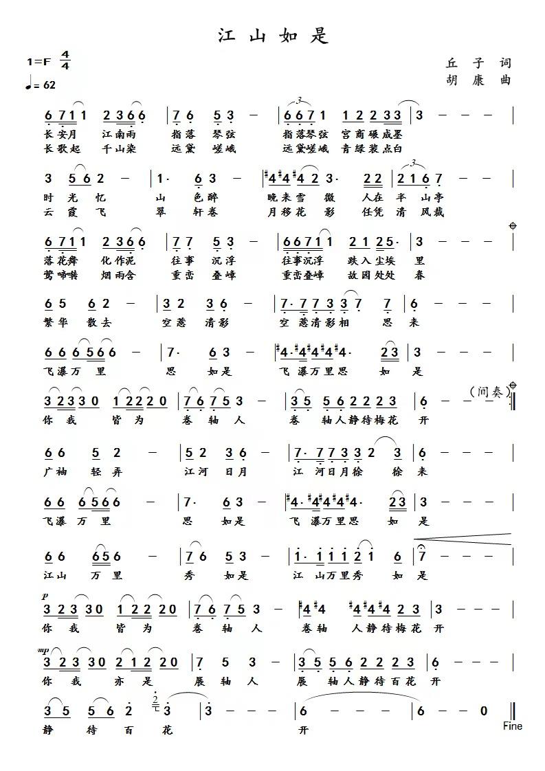 一点牡丹红,一挥万山重;一曲长城长,一缕茉莉香。只此青绿,只此宫商。月之皎皎,千江一色;水之汤汤,万年东流。江山万里尽在历史章回里兴衰,思载百代岂非于山川笔墨中更迭。生于斯长于斯,祖祖辈辈,生生不息。江山如画,每一笔都由我们描绘,又徐徐展开。是这块土地蕴育了古老的中华民族。词作者有感于是,用古朴典雅的辞法谱就了《江山如是》。