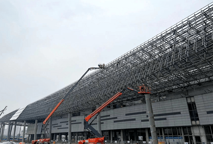 为保证项目主体结构关键节点,机电安装两班倒,保证工作前置;二次结构方面,为应对工期紧任务重的情况, 项目部生产团队积极行动,倒排工期,分解并锁死各专业节点目标,穿插施工。技术团队通力协作,编制技术方案做技术交底,商务团队与物资团队提前做好各项招标采购工作,协调好各方资源,攻坚克难。截至当前,标准展厅二次结构完成70%,幕墙完成50%,金属屋面避水工作正在展开;多功能厅主体完成100%,钢结构完成30%幕墙完成20%;会议中心地下室完成90%,钢柱吊装完成80%;第一接待中心主楼完成至10楼,附楼地下室完成100%;游客中心地下室完成100%。