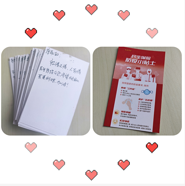 虽然疫情阻隔了与用户的距离,却阻隔不了民生保险对用户的诚挚关怀。在当前疫情最严重地区的上海分公司心系客户,第一时间成立援助小组,购买了500份口罩、碘伏、酒精、棉签防疫物资,并以最快的速度分装打包,在每份礼包里有放有放疫小贴士和关爱卡,在全市封控前将每份防疫大礼包送达到用户手中,让用户感受到公司温暖和爱意。浙江、安徽等分公司为因疫情影响不能来柜面办理业务的用户,做好自身防护工作后积极上门办理服务,为用户解决难题。爱与责任,是民生保险人共同的责任和使命。 心有大爱 志愿服务“冲在前” 面对新一轮的封控,民生保险涌现出一批又一批的志愿者服务队,他们坚守战疫关口,主动下沉支援社区抗疫,以自身行动践行着“让民生确定,为民生服务”的企业使命,化身“大白”、“大蓝”加入到街道、居委、社区的志愿者服务中,参与协助宣传引导、分发物资、社区巡逻等志愿服务,与社区基层工作者并肩作战,共同筑牢社区疫情“防护墙”。自3月以来,民生保险累计志愿者服务人数140余人,先后提供志愿者服务超过700次,其中核酸采样检测扫码约1.32万人次,协助登记人员信息约1.39万人次,送核酸检测样本试管2100余次,入户发放抗原检测试纸600余次............用实际行动诠释初心和使命,为广大居民坚守重要关口,在疫情防控一线贡献一份力量。