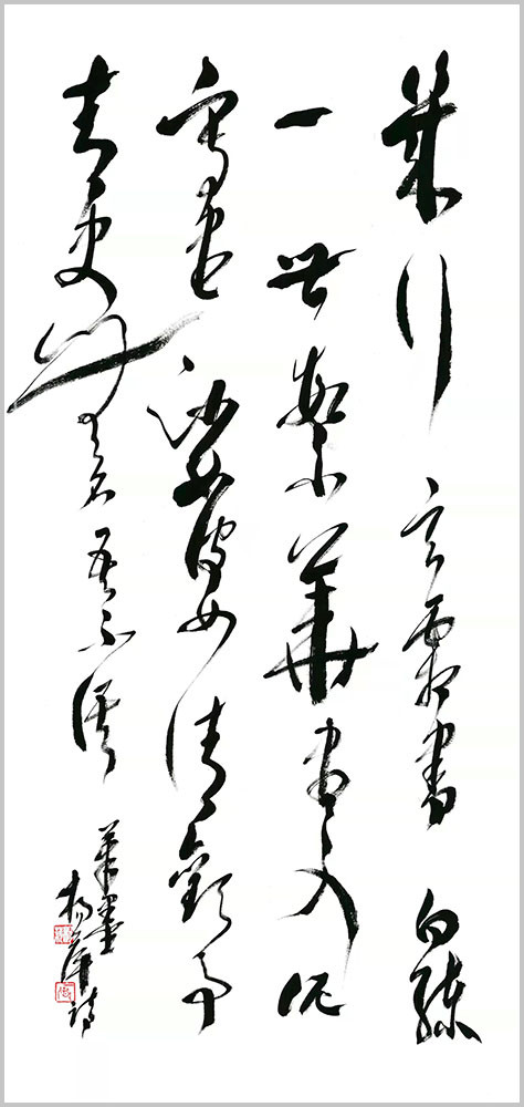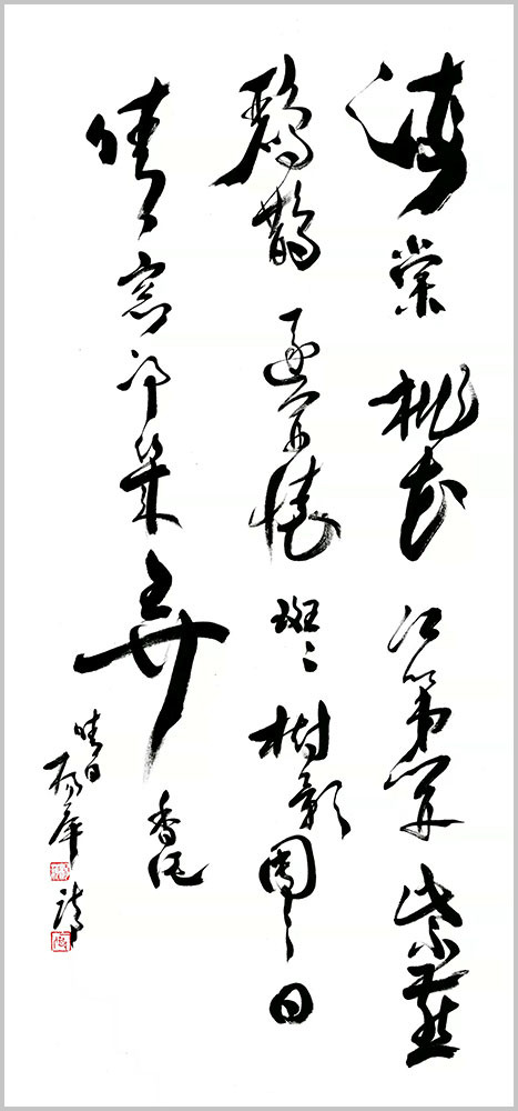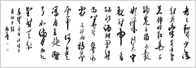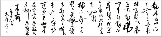 杨萍自作七言律诗草书《阮籍》 杨萍女士的书法之所以赋予其严肃而独特的艺术内涵,是因为她内在的修为与境界的升华,赋予作品诗意的美感。在主观理念、意蕴、才情的驱动下,善于汲取、变通、融化、创新。在她笔下,书法的意趣与传统古法一脉相承,从博大精深的中国文化细微处体悟书法应有的蕴积和厚重,以古朴、简洁、灵动的笔法笔意,体现出灵动、清明、超逸的艺术品格。将诗词文学与书法艺术融会贯通、以文书意,让作品中无不蕴藏着深厚的文化内涵。通过杨萍女士的作品可以看出,习古而不拘泥,创新而守法道,用笔气韵流畅、刚柔拙巧,秀丽中不乏挺拔,苍劲中不失含蓄。书法的意趣和笔墨线条的韵律表现出博大圆融的境界和追求自然的精神。作品整体上看起来秀丽、温婉,线条不以厚重取胜,而在恬淡中表现其运笔的畅达与精致,于洒脱之中见灵秀之气,以儒雅骏逸的艺术风格保证了字里行间的精神之气。通过其作品,窥其创作心态的自由自在,意趣盎然,笔划之间尽显淡然韵致,洋溢着一种清雅的艺术品味,正是这种特有的抒情格调,显示了他书法中的正大气象。