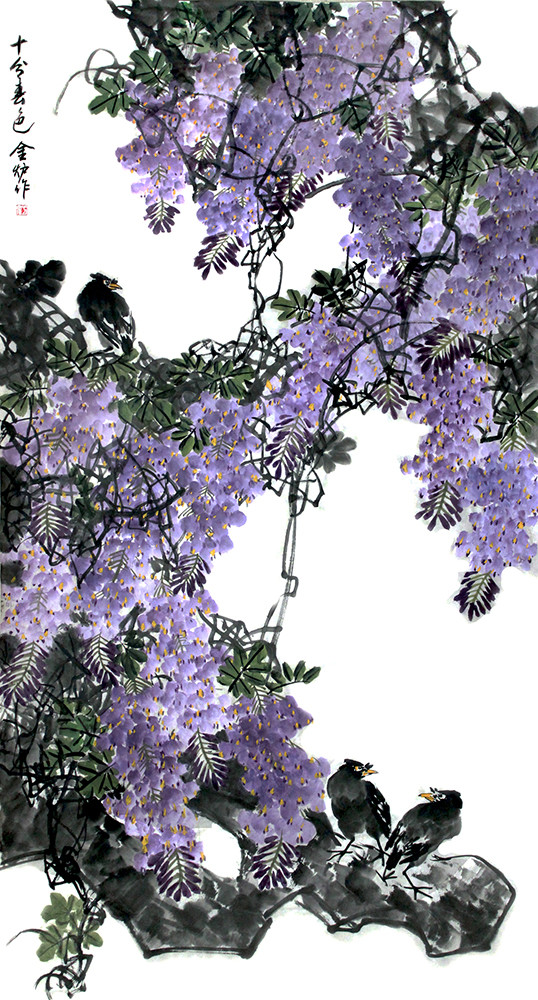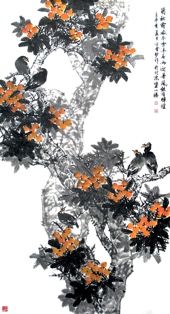 风格孤高傲尘外、烟波万里一江秋(136x68cm)作于2012年 方金炉在长时间的写生实践中,师法自然,善于从自然世界中寻觅美和表现美,他在生活中留下了许多写生的足迹,汲取素材寻找创作灵感,与自然的共融形成情感释放。观其山水画作品,有富于人格精神的意象世界,以淡雅的笔墨带来一种大气磅礴之势;以笔蕴气、以墨取韵,作品空灵典雅,远山近峰虚实相映,带给人一种清幽、雄浑之美感。尤其注重笔线点画的势态;所体现的一气呵成,笔笔相生、笔笔相应的内在气韵,也是他的作品获得峥嵘、刚健、雄伟的气象所在。从他的作品中,我们看到的不仅是画面的唯美、雄健、大气磅礴,还有自然界的清静与优雅,读到的不仅有他对大自然的深挚热爱,还有时时透显出来的灵秀、隽永、神韵、和谐;将大自然的美轮美奂、无限生机淋漓尽致地表现出来,让人回味悠长。在花鸟画意象的追求中,方金炉注重传统笔墨的当代精神价值的融合,融心境在其中,强调传统笔墨的继承。作品从内到外,从形到意,可谓皆有一股高逸之气循循而生!无论是用笔的勾勒、运线、还是用墨的色彩浓淡,均自然透出笔端,不仅强调笔墨的写意性,更多的是所追求自然界中的恬静、闲适的品格。正是这种赋予花、鸟、兽等物象自然流淌的天趣,使他的创作能得之于形、畅达于意、情尽神妙而焕发出流光溢彩的自然美感。方金炉以饱满的热情不断深入生活,体验自然,通过写生创作了大量充满蓬勃生机、富有神韵盎然意趣的艺术作品。在这里,我们汇集了他的书画代表作和近年的新作,一起领略他别具一格的诗意韵律和清气扑面的艺术气象。 ![]() 方金炉,1944年生,浙江金华人,1967年毕业于浙江大学,就职于北京某研究所。科学家,红学家,国画家。中国国学学会副主席,《艺术人物》杂志社荣誉社长,中国文人研究院名誉院长,中国数字艺术馆馆长,中国艺术百科艺术总监,檀香山艺术学院名誉院长等。 创作有大量中国花鸟画和山水画优秀作品,格正气清,儒雅文静,学术底蕴厚实,个人风格鲜明;笔墨功底扎实,时代气息浓郁,在继承传统的基础上大胆创新,成就卓越, 贡献突出,感染力和影响力强大。