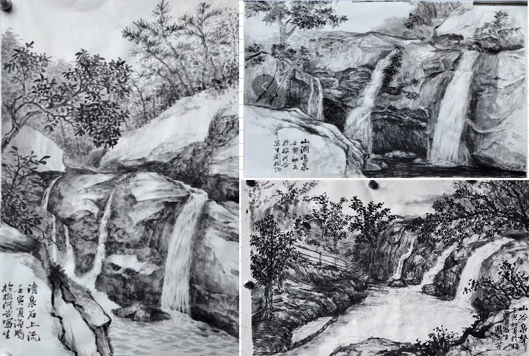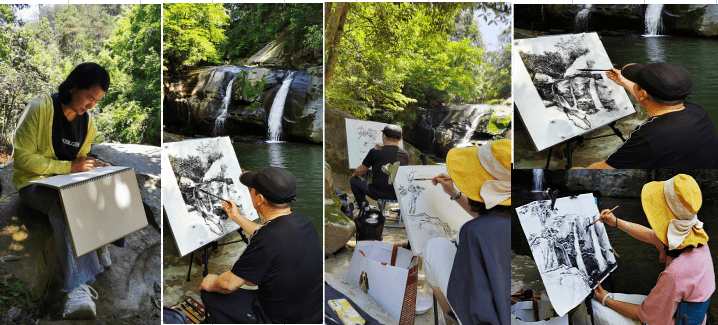 写生力求对自然景象进行深度的感性挖掘和自然理性的回归,通过眼前的景象来传达一种心境,通过笔墨语言把这种心境和国画艺术结合起来,处理画面时,从客观自然入手而又要超越客观自然,成为人文的客观,即一种认知的客观、文化的客观、笔墨的客观。更主要的是对山水画艺术语言本体的认知。这样不会盲目遵从自然,被自然束缚。能深深植根于生活、长期保持和自然的良好互动交流,在写生中消化传统、研究自然规律、融贯画法,孕育出富有个性的新的艺术。 图4:写生剪影