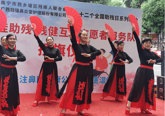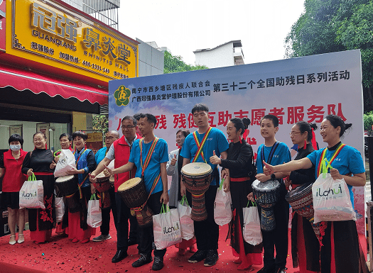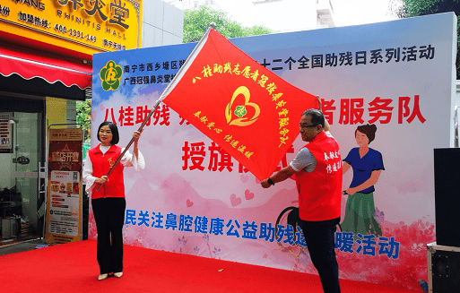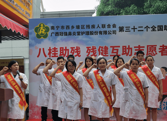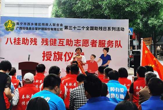 为庆祝第32个全国助残日,5月15日下午,广西冠强鼻炎堂护理股份有限公司联合南宁医博中医肛肠医院、广西医大晶亮眼科医院、广西无障爱科技有限责任公司等爱心企业,共同举办了“八桂助残,残健互助志愿者服务队”的授旗仪式暨助残活动启动仪式,在南宁市天桃路举行。