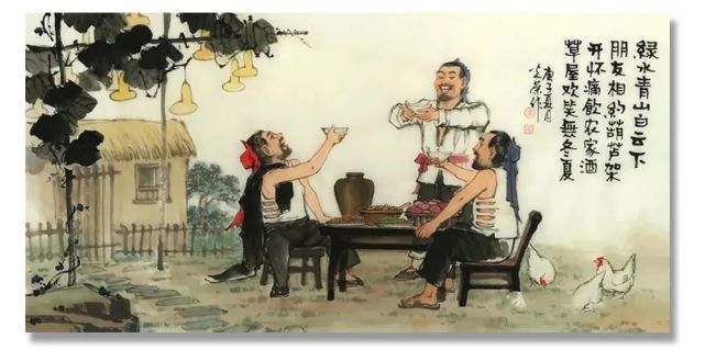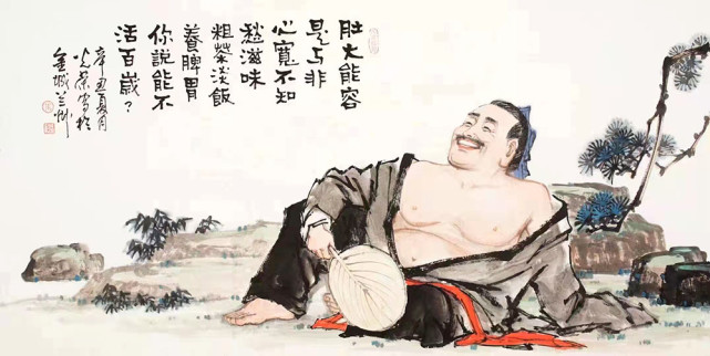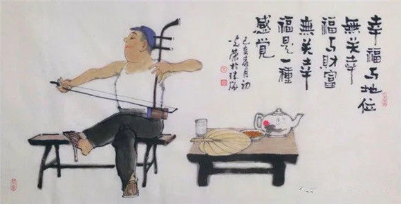 《肚大无忧》 138X68cm 写意是中国画的精神所在;所谓“意在笔先”,是创作者的感悟而倾注了主观“意”的成分。朱光荣是集学问、学术、学养于一身,对国画和漫画有着天生的感悟力。作品继承了传统水墨的笔墨韵味,通过自身感悟表现当代生活,在题材内容和形式手法上不断拓展,努力延伸文化内涵及艺术表现力,形成了诙谐生动、妙趣横生的水墨谐趣画。朱光荣是漫画家,但其作品处处可以看到国画的韵味和笔墨;在情节,造型及动态上处处可以看到漫画的构思和夸张的手法!在创作中,朱光荣既注重传统笔墨技法的运用,又注重漫画艺术中幽默元素的发挥,画面简洁有致,主观意识更为强烈,尤其是呈现情景需要,富于笔墨线条的表达,增进整体人物形象的精神内涵指向。作品既文图相配,相得益彰,又富含寓意;进而表情达意、动人情感。在朱光荣的笔下,每个人都有独特的相貌特征和性格禀赋,荡漾着浓郁的生活气息,保持简约、灵动、大方的整体感和品位。画面中对人物神情、形态、精神的点化极为精微细致、结构工致细腻,造型准确动人,动静结合的韵律中,实现了整体主观意识表达和精神述求。基于传统笔墨语言和时代文化的结合,创作出盎然的情趣,营造了清幽的意境,使作品充满生机勃勃的活力。
