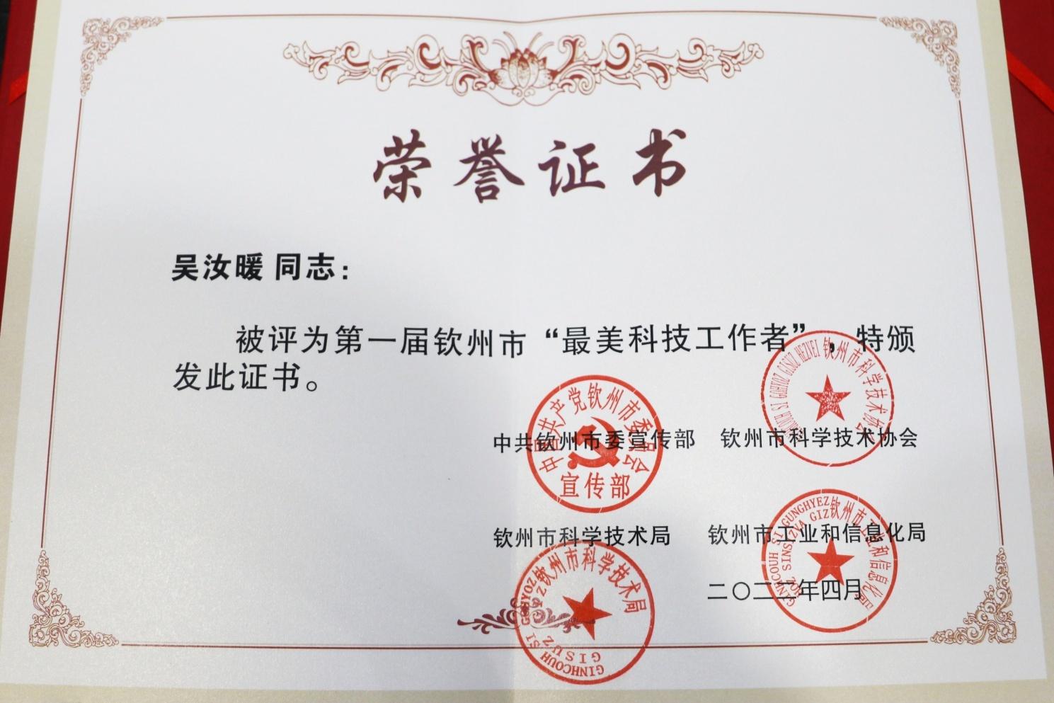最美科技工作者是中国科协、科技部等部门联合举办的学习宣传活动,自2018年以来已连续举办5届,每年选树10位先进个人。本届是广西钦州市首届“最美科技工作者”学习宣传活动,吴汝暖光荣上榜,这是党委政府对民营医院科技人才的关怀!