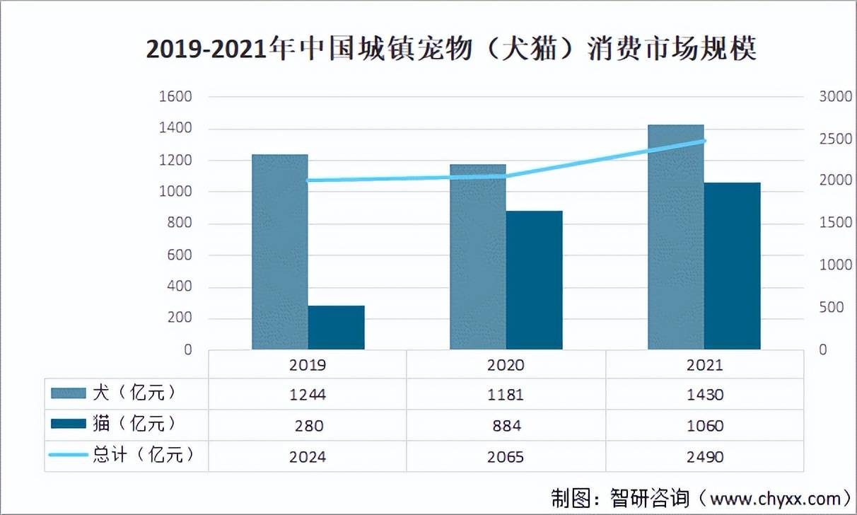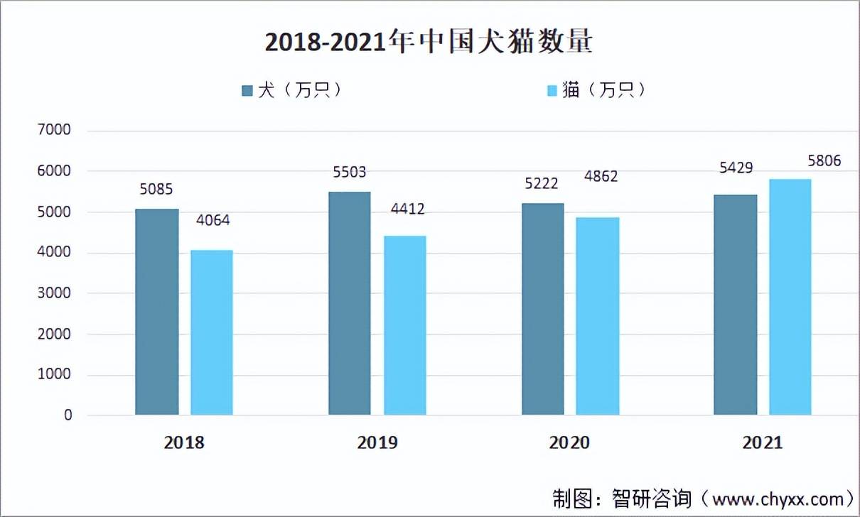 截止2021年中国完成登记的宠物犬数量总计有5429万只。相应的宠物犬消费市场达1430亿,同比增长21.2%,比2021年社会消费品零售总额高8个百分点,可谓是在疫情影响下,逆势上涨、持续走高的新兴产业。并且随着我国宠物市场的不断发展,仍保持非常明显的增长趋势。