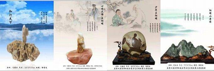 图2:知行天下 图3:心学大师王阳明 图4:少年王阳明 图5:阳明山居图 在赏石艺术之路上,阳明先生的心学同样成立 。石头是面镜子,可以“以石读人、以石化人、以石说史、以史评石”。人们在观赏徐宝达奇石的同时,吸取到了阳明先生的心学思想,可谓一举多得 。阳明先生一生跌 宕起伏,“真三不朽”就是至今为止,古人今人对阳明先生最高的评价。其来自《左传•襄公二十四年》中曾说:“太上有立德、其次有立功,其次有立言,虽久不废,此之谓不朽。”这些经典石头的造型、色彩、质地、包浆、韵味等深刻印象触 动了我们的心灵,给我们以力量,这正是一种受到“天人合一”心学思想影响的象征。 奇石写春秋 东方出芙蓉徐宝达先生所居的余姚有七八千年的历史。他说中国石文化也有数千年的历史,而他自己的名字里就带着宝 字,可能冥冥注定。河姆渡遗址的标志“双凤朝阳”,在他的奇石里可以看到 。徐宝达先生有句不平凡的话或是对华夏奇石的呵护:“天公造化了奇石,人类要珍惜奇石的天然唯一性和稀缺性,尤其是对珍稀的纯天然人物图案石和天然人物造型石以及红色革命历史题材石,更要保护好,世代传承下去”。在鉴石赏石上,徐宝达以石育人,其藏 石室看到一些红色老物件 。他藏石的另一个主题,就是把中国传统赏石文化和红色文化结合起来,是其创新赏石文化的另一个特色和亮点。