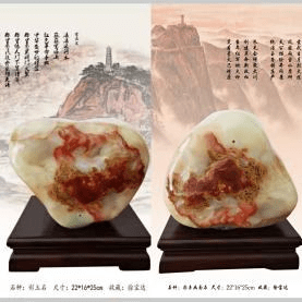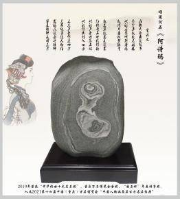 图8:阿诗玛 该石是大自然巧夺天工之作,在全国著名奇石中,属于新发现的石种。这方画面石属江西潦河的“水纹石”,是单纯的一种沉积岩,画面变幻若水若云,线条流畅,色泽清雅,画面规中,秀丽完整。著名鉴石赏石名家、军旅奇石收藏家、书画家康景海有诗云:“神似其人,头巾绕层,乌云发顺,流苏叮咚。双手合十,天朗泉静,百鸟不语,禅定和风”。该石的收藏者徐宝达云:此 方潦河画面石《阿诗玛》,自然天成,罕见珍稀,经穿越时空亿年岁月,与人类相见,可谓是中国非物质 文化遗产的缩影和佐证 。这正是:在那云南彝族撤尼,有个美丽勇敢姑娘,她的名字叫阿诗玛,她的 身影化成奇石,她的声音回荡石林,她的影子刻在石中,她的故事流传人间,她的精神永远颂扬 。该 石主题鲜明的把人引入到了“阿诗玛”的文化和故事之中。 在奇石界出版的《中国造型石大典》上,用十页篇幅介绍了徐宝达的十块入选藏石。 他的奇石气象万千,意境深远。他的藏石中有造型石、画面石、奇石宴、印章石等精品奇石1000余方。他的藏石品种丰富:产地有新疆戈壁石、云南黄龙玉、江苏太湖石、广东英石、广西大化石、贵州乌江石、福建九龙壁、安徽灵璧石等数十个石种。《中国造型石大典》两位主编雷敬敷和刘昌沛为其入选藏石配诗,其中有一方太湖奇石“碧涧流云”,出自江苏,刘昌沛有诗云:“九华奇秀石玩中,碧涧流云处处通。疑是东坡昔所供,太湖波涌送玲珑”。另外一方黄龙玉命名为“寿桃”,出自云南。雷敬敷精彩赋诗云:“玉润万载蟠桃黄,曾在天宫呈玉皇。悟空当年桃园度,碰落一枚人间藏”使石和诗相得益彰。