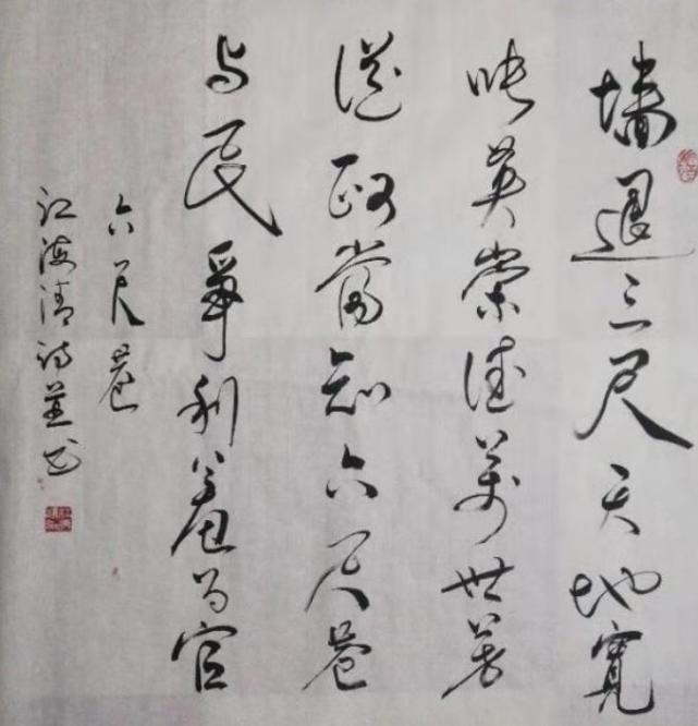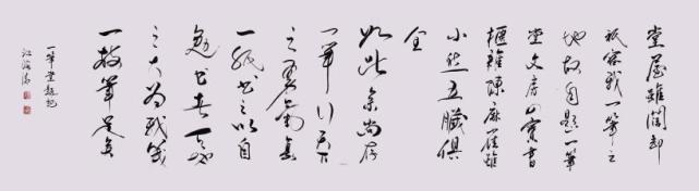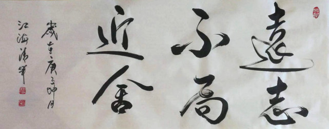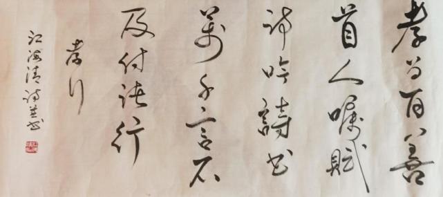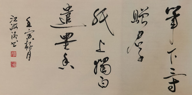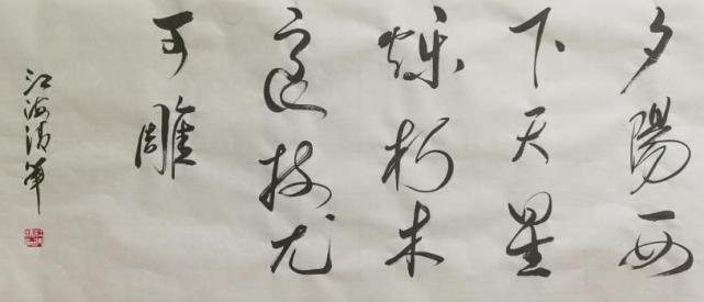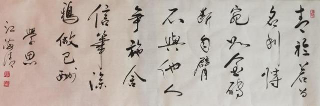 江海清作品 书法最主要的是文字的情感和文学的内涵,即所谓的“书以载道”。作为诗人书法家,江海清先生宽博、自然的书法,既能表情达意,又能体现出文人情怀,把诗文才华融入到书法的笔墨之中去,做到笔有诗韵,墨有诗情,字如其人。江海清先生在书法中能够吸古人碑帖的法度,让碑的质朴、帖的韵势,在浑厚、质朴中渗透出流动与婉约,使书法的形态有更多变化,内涵更丰富,美感更强烈。作为诗人,他的诗雍容大气,富有强烈的感染力;作为书法家,他的字雄健沉稳,以刚劲挺利的审美形态得到充分显现。其诗词与书法相渗互溶,相得益彰,呈现出一种协调统一的艺术美感,凸显出其深厚的文学修养和扎实的笔墨功底。观江海清先生的作品,整体上表现出一种清新的气象,既有碑的功夫,又有帖的灵动,用笔健劲且轻松,流畅不失沉着,结字工整而不失生动,既宽博雄放又紧凑严密,可谓是集众家之长,融汇于心,疏朗峻拔之中,透着一种自然与率真,呈现一种和谐的中庸之道,中和之美。