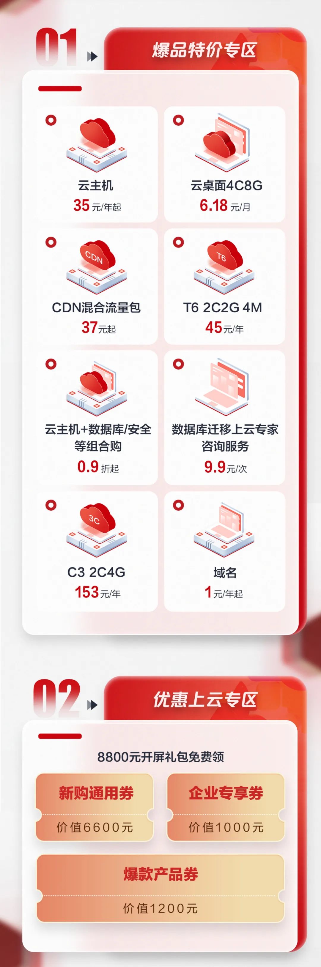 01开屏红包用户注册即领价值7800元的开屏礼包,企业用户可叠加领取1000元上云礼包,共计价值8800元红包助力轻松上云。