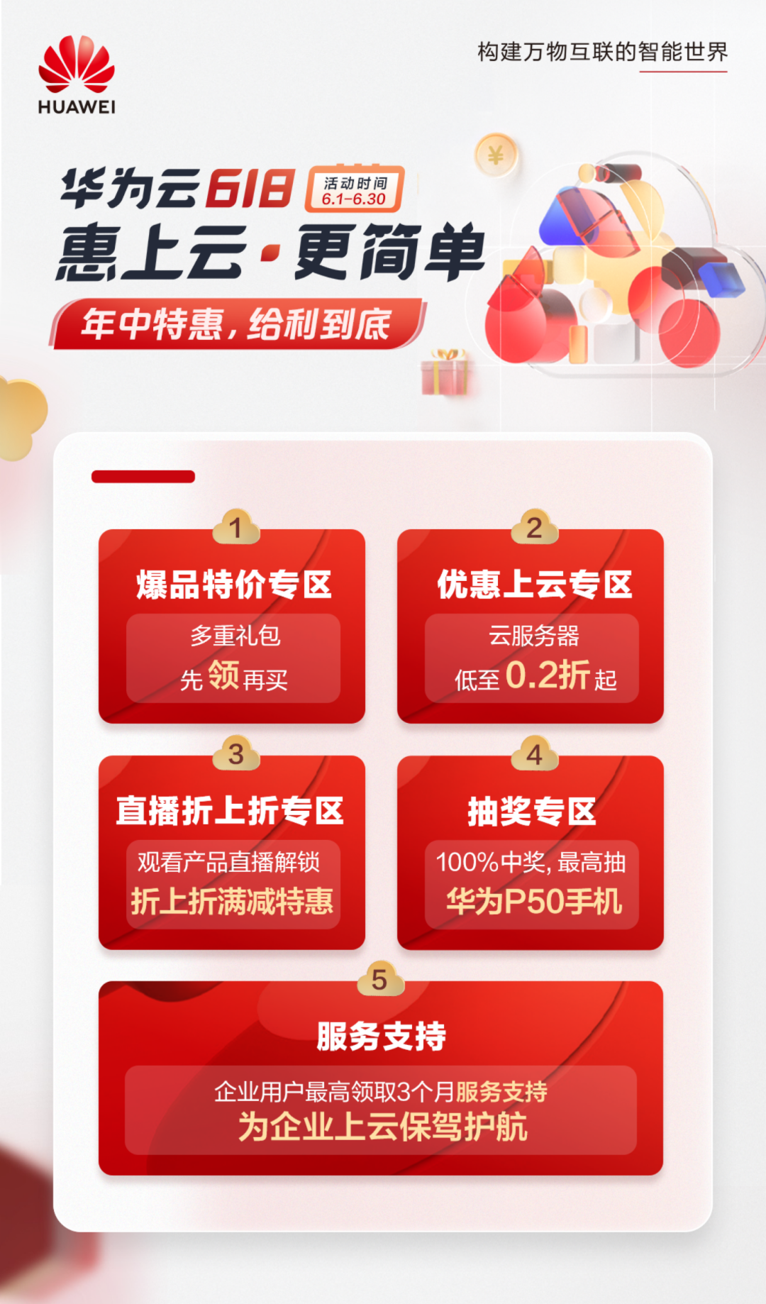 02付费认证抽奖活动期间完成企业认证,或新购金额大于1元的用户,既可获得1次抽奖机会,最多抽2次,每次均100%中奖,最高可得华为P50手机。 明星产品齐上阵,钜惠抢购正当时 除了丰富玩法,云服务器、企业应用、云数据库、大数据等全品类产品纷纷亮相华为云618活动,好不热闹!多款明星产品钜惠来袭,满足用户一站式上云需求。