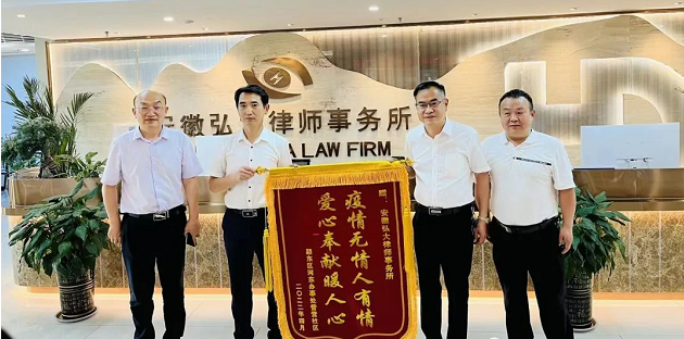 2022年6月2日下午,安徽阜阳市司法局副局长赵伟、阜阳市依法治市办公室秘书科科长张涛、阜阳市司法局律师工作科科长侯洁琼陪同颍东区河东办事处訾营社区副书记訾如山、社区主任訾如雷等一行人,为弘大所赠送一面载有“疫情无情人有情,爱心奉献暖人”的锦旗,以此感谢在疫情防控时期,弘大律所为訾营社区疫情防控工作的支持。弘大所党支部书记张华、执行合伙人杨峰主任,带领本所部分律师参与了本次活动。