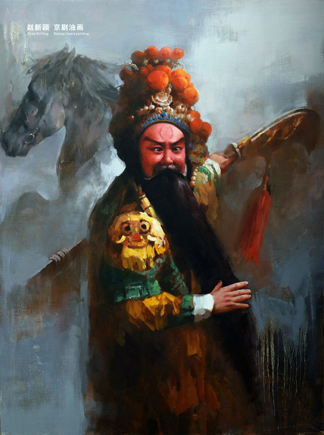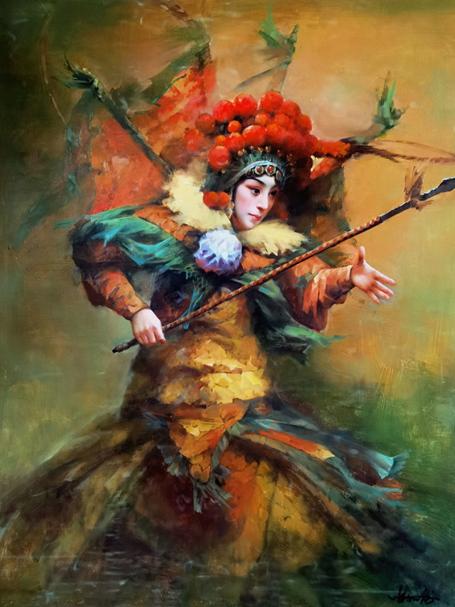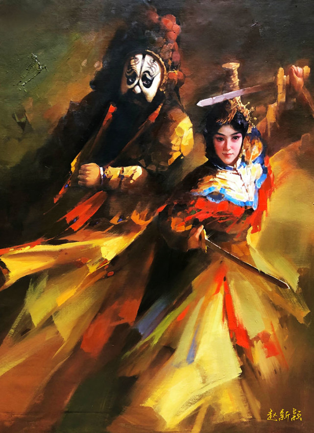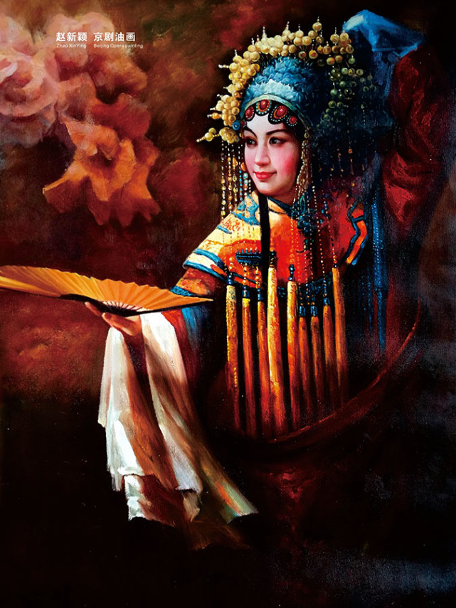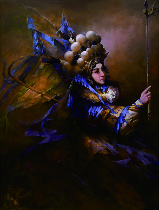 赵新颖作品 在赵新颖的京剧油画作品中,我们感受到的是中国传统文化的精髓和审美。他利用西方写实绘画技巧和色彩来诠释戏曲艺术,中西结合、兼具写实和写意,始终透着一种细腻、柔软的至美典雅。在他笔下的京剧油画,最大程度地发挥色彩的特性、烘托人物情感,对表情动态、服装材质、冠带饰件等细节作了详尽的处理。以写实的风格,独到的油画笔触,捕捉戏曲表演瞬间运动中的张力,以形象、人文、色彩的深邃,表达其思想情感、品位和格调;淋漓尽致地画出戏曲精气神,洋溢着生命的活力与内在的气韵之美。赵新颖的画作除追求人物的形、神外,更生动和谐地展现出了京剧人物的韵味、趣味和戏味。运用多元化的特殊艺术手法,融入自我情感,不仅对京剧人物在舞台上的形象拿捏得当,而且作品充盈着达观的神韵。让观者在欣赏时仿佛置身于京剧艺术的强大气场之中,无不为之感叹,为之倾倒。在画面的烘托以及整体把握上,赵新颖营造了丰富的审美内涵,构建了自己的审美体系,使观者能够感受到作品内在精神方面的追求,形成了独有的绘画语言。