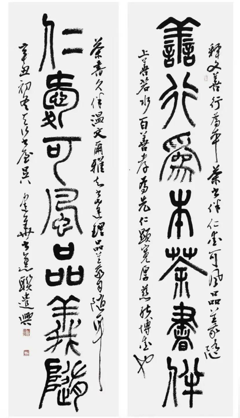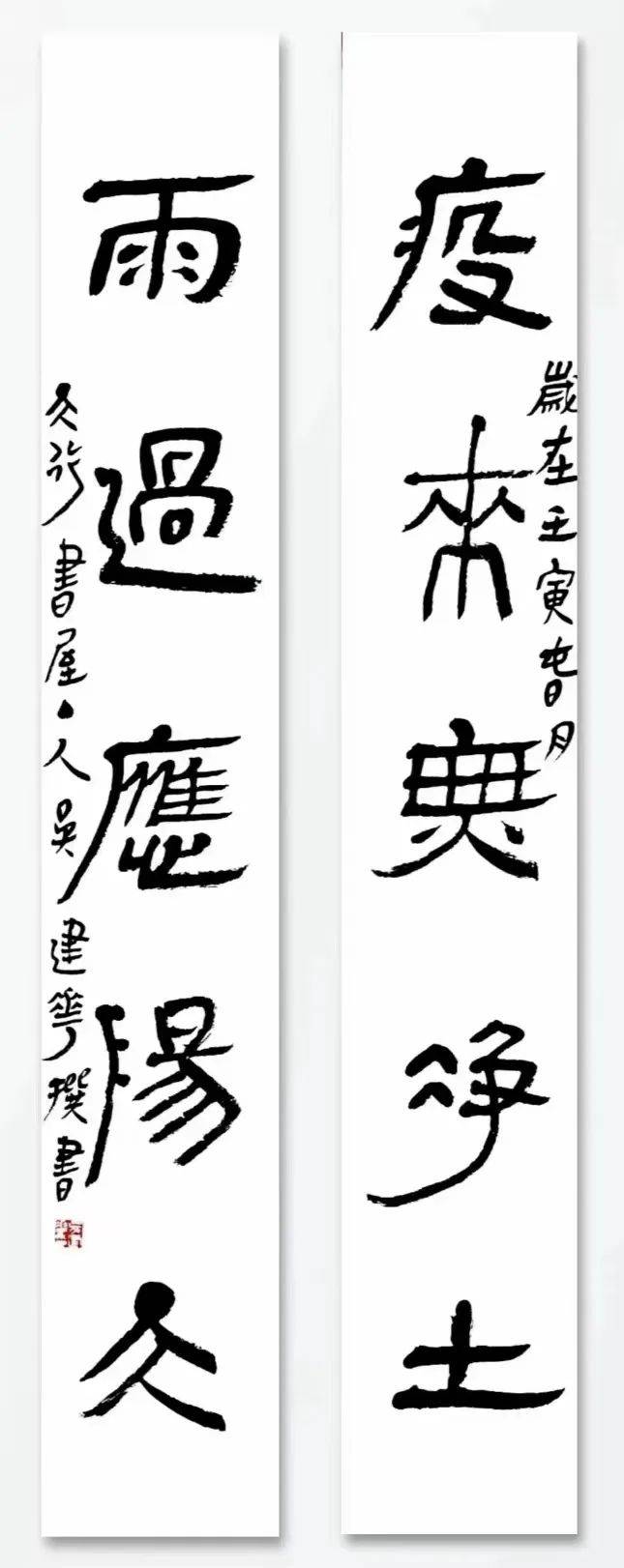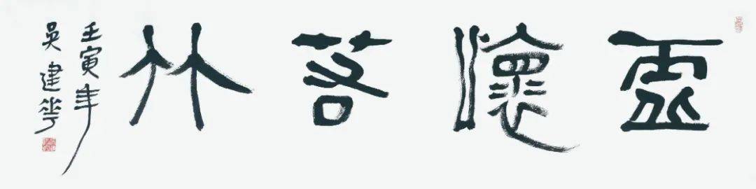 建华师从著名书法家姜华先生,在跟老师的习书过程中,他从适园获得了更多的理论滋养和人生感悟。比如豁达、比如热烈、比如雄健、比如大气,把自己的秉性和气质融入到自己的作品中去。字法、笔法、墨法、章法乃为技;情感、架构、学识、修养可近艺;人文合一、文书合一、人书合一可臻道也。鉴于此,他对自己的书法理论学习和书法技艺探研要求得更高。建华知道,近些年来新书派和传统书派构成了中国书法创作的独特风景,新书派在注重内容的同时更注重形式,而传统书派则对书法进行传统意义的坚守。所以建华有着自己清醒的认识,在他心中书者首先要打下坚实的书法功底,有了功底作铺垫,作品的神采方能展开。无论新书派或传统书派,只要处理好创作中的“本”“末”问题,一切的矛盾都会迎刃而解。新书派不能脱离传统书法的滋养,传统书法也不能固守“传统”而一层不化。脱离了书法传统的新书派是无源之水,没有创新意识的传统书派也会与时代背道而驰。理解了“本”“末”的关系问题,新书派和传统书派的书法创作就多了一份沟通和理解,就多了一份圆融和豁达。展现在我们面前建华的书法大小皆擅、五体俱佳、文墨并重,其楷书清丽内敛不失儒雅稳健,行草潇洒飘逸不失力量对比,隶书厚实质朴不失俊朗灵动,篆书古朴方正不失月朗清风。在建华的书房里呈现着“水润淮安”的坚韧与柔情,在他的理念中,书法是表达内心世界的波澜壮阔。