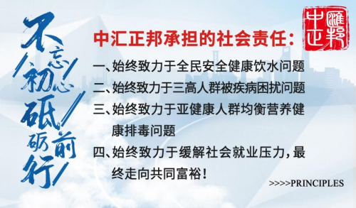 中汇正邦不忘初心砥砺前行,始终致力于全民安全健康饮水问题,始终致力于三高人群被疾病困扰问题,始终致力于亚健康人群均衡营养健康排毒问题,始终致力于缓解社会就业压力,最终走向共同富裕的宏伟蓝图。