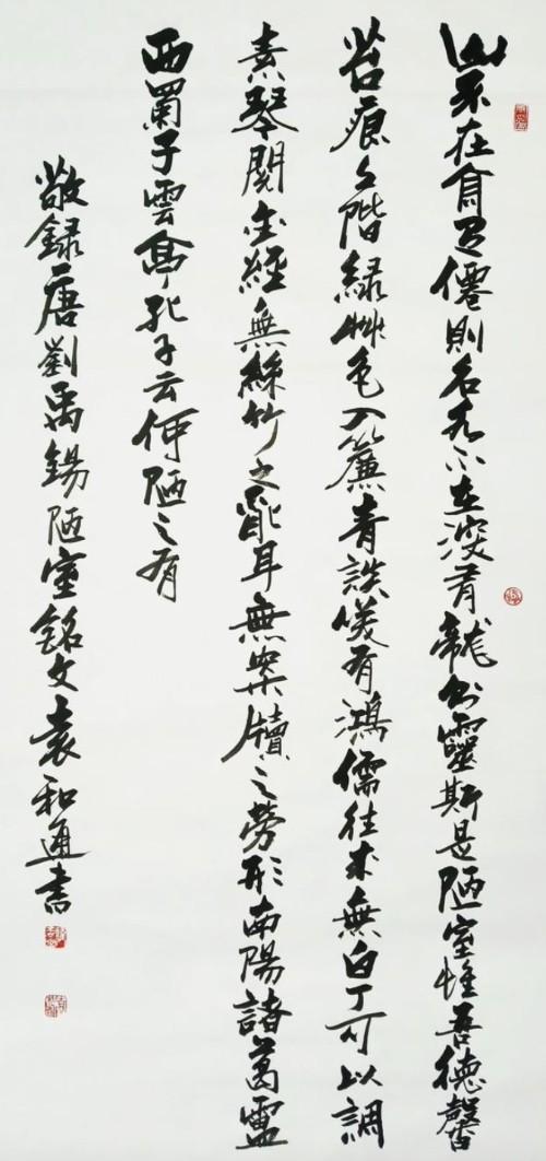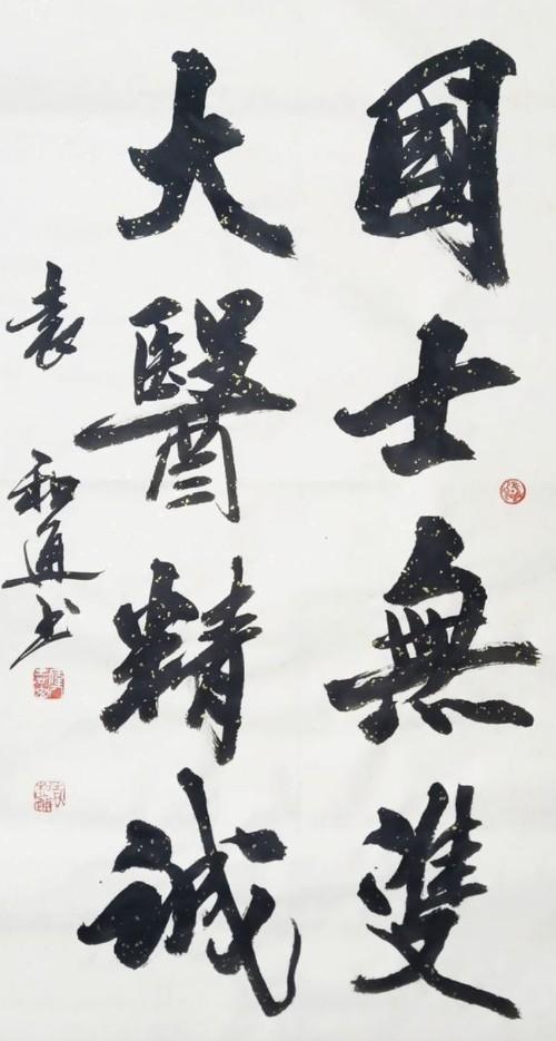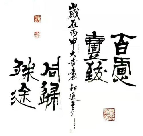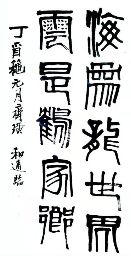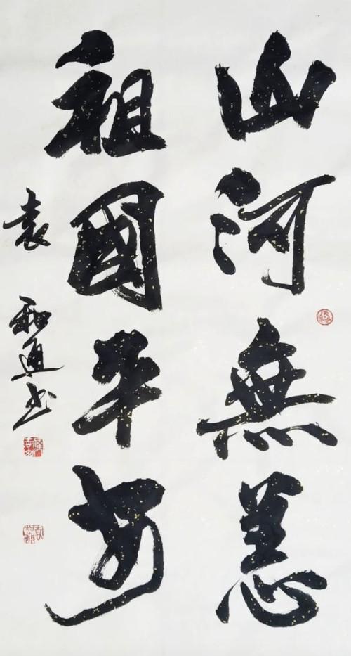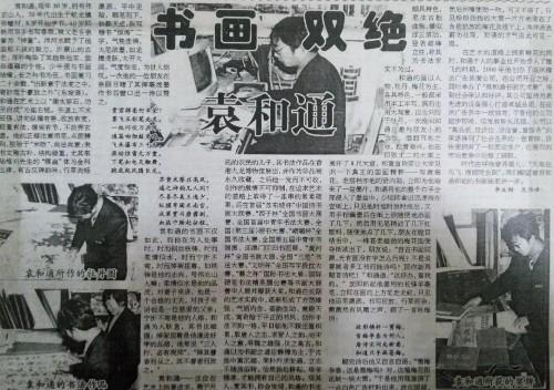 袁和通的书画不仅如此,而他在为人处事时,时而钢如铁铸,时而柔情似水,时而宁折不弯,时而掉架屈尊。如铁铸是他的志向,号伟志山人嘛;柔情似水是他的品质,对妻子来讲,他是一个合格的丈夫,对孩子来讲他是一位慈爱的父亲;宁折不弯是他的人格,和通为人耿直,其书也雄强;掉架屈尊是他谦逊好学的品格,他常说“三人行,必有我师”,“择其善者而从之,其不善者而改之”。