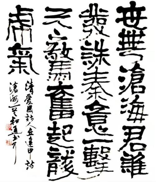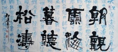 袁和通,别号伟志山人,70年代出生于蛟龙镇张疃村,8岁开始学书,10岁即能用双手书写春联,被父老乡亲誉为“神童”。沭河水赋予了他坚韧不拔的毅力,沂蒙山的古老、浑朴陶染了其趋势拙实、温恭蕴籍的个性。少年便与书画结缘,长之与书为伍,书画兼习二十余载,“出新意于法度之中,寄妙理于豪放之外"(东坡语)。和通在艺术上以“滴水穿石、功至自成"为座右铭。书道上不求狂怪.讲究纵横有势,收放有度,轻重有法,缓疾有节,不故弄玄虚。他的正楷注意用笔,点画精到,脱胎于“米欧”,尚法尚意:隶书文雅古朴,结构稳重,尤其奉陆维刈先生的“稞扁”体为金科玉律,有古汉碑韵味:行草流畅潇洒,平中见险,顺笔而下,妙趣天成。所写榜书“惊涛”二字,气势连绵,大笔浓墨,如龙腾虎跃,大开大阖,气度恢宏,为世人惊叹。一次他的一位朋友在亲眼目睹了其挥毫拨墨作书后曾口出一诗以赞之:赏君挥毫何幸荣?墨飞五彩笔走龙。一纸巧伏刀兵阵,通篇响彻鼓角鸣。飞来瀑布三千丈,滚动惊雷九万重。下笔如电天鞭舞,腕底起风腾巨龙。苏黄米蔡启高风,通之神韵几人同?尽善尽美王逸少,纵横卑阖米南宫。我辈赏书磨霜剑,血热衷肠赴征程。