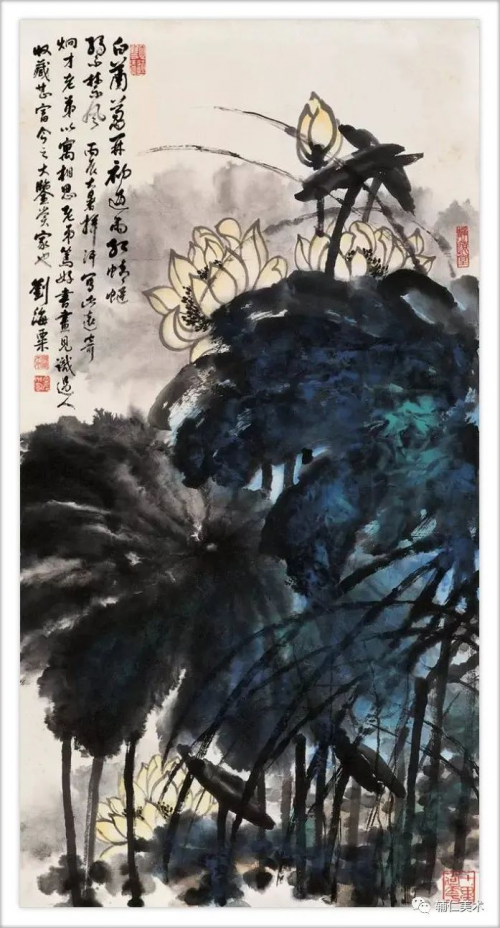 刘海粟 《荷花》 1976年作 刘海粟在美术界有着很高的艺术成就,精通诗书画印及中西方绘画理论,作品蕴含着深切的精神价值和情感价值,他的艺术理论和创作实践将对当代中国山水画的发展产生重大影响。在中国山水画的继承、开拓和创新上具有非比寻常的艺术指导意义,笔墨与意境更是开创了一种新的中国画的表现技法。 一、用笔 笔是中国画民族文化传承的一种造型方式。纵观中国历代画家他们都是通过笔来进行绘画、抒情、达意,在画境中融入自己独特的绘画风格和思想,形成了他特有的丰富多样的绘画语言。早年苍古沉雄,线条有钢筋铁骨之力;中年潜心于泼墨,笔飞墨舞,气魄过人;晚年运用泼彩,色彩绚丽,气格雄浑。笔意挥洒,在画中无论画感的动态有多么的狂野都能将画的意境完美的定型在白纸上这就是用笔作画的独有特性,是动与静的结合,是感性的笔法和理性的笔法的完美结合。