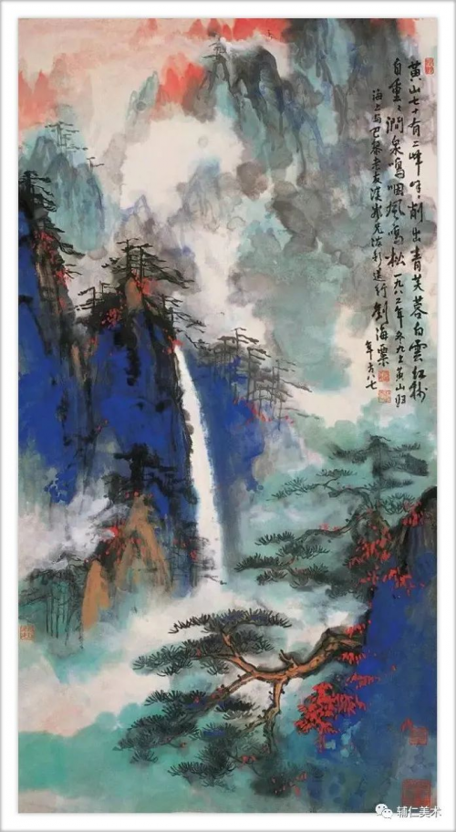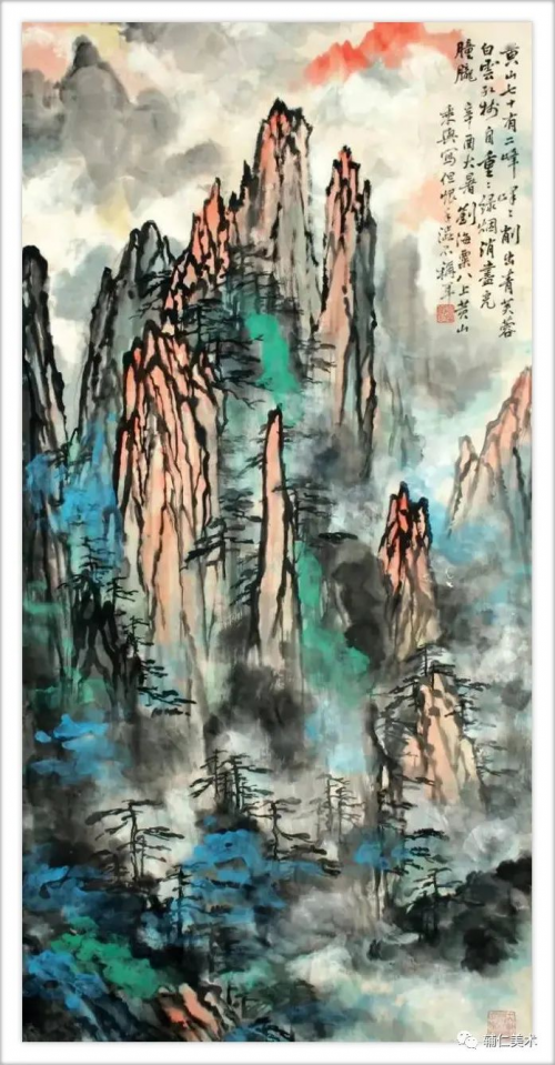 刘海粟 《黄山》 1981年作 三、意境 意境是中国画追求呈现的最高精神表达。刘海粟的山水画画风豪更奔放、色影浓重,是一种介乎于抽象与具体之间的状态,是中国画风的基础与西方元素的融合,是中国画自身的风格与现代人审美习惯的统一。大气磅礴的气势,笔飞墨舞,挥洒自如,深厚的绘画功底,注重色彩与场景的搭配,色彩华丽,飘逸流动,不同的距离中会给人不同的视觉效果,使得大多数人都能看懂他的画,欣赏他的画。