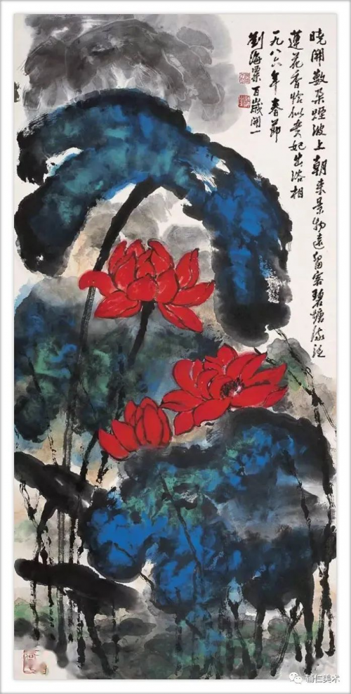 刘海粟 《红荷图》 1986年作 坚持“融合中西以创新”,“发展东方固有艺术,研究西方艺术蕴奥,从创新中得到美的统一”,不拘泥于传统的画法,推陈出新,注重写实写生,以豪放、劲拔、多姿的表现性格,挣脱了传统笔法的束缚,形成了刘海粟自身的绘画特点。 |