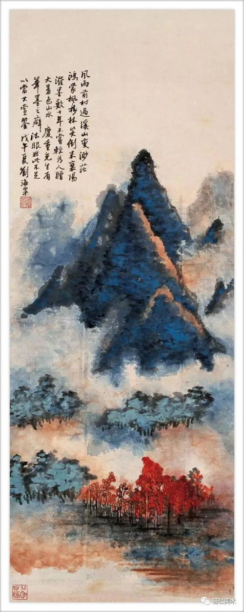 刘海粟 《溪山鸿蒙图》 1978年作 二、用墨 墨是中国画民族文化传承的一种色彩方式。刘海粟以“青绿”、“水墨浅绛”、“泼墨”的为主的泼墨泼彩画法独树一帜,作品具有强烈的光色效果。是通过笔墨和色彩在宣纸上面形成浓淡的区别,虚实相生,给人一种透光的视觉感觉,进而表现色彩的变幻万千的神奇现象。墨彩粉彩并用的方式,将西方的色彩技法与中国的绘画工艺有机地结合起来,是印象派的中国式呈现,是西方技法的东方式表达,是随意性和自由性大胆的现代性突破。
