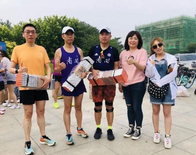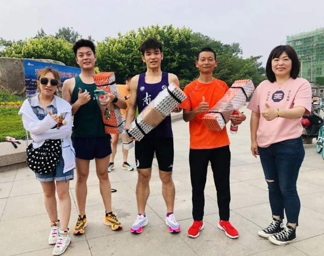 4月跑量前三甲:冠军邢强-00计算机网络、亚军刘昕-88级国外贸(左一)、季军刘超-18级MBA(右一)。奖品:专业运动袜。