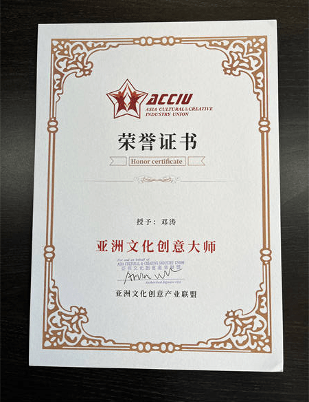 2022年6月22日,在世界文创之都杭州,乌节国际中国区总裁吴文军先生正式获任亚洲文化创意产业联盟主席,并授予邓涛先生“亚洲文化创意大师 ”、“原创设计金奖”荣誉证书。